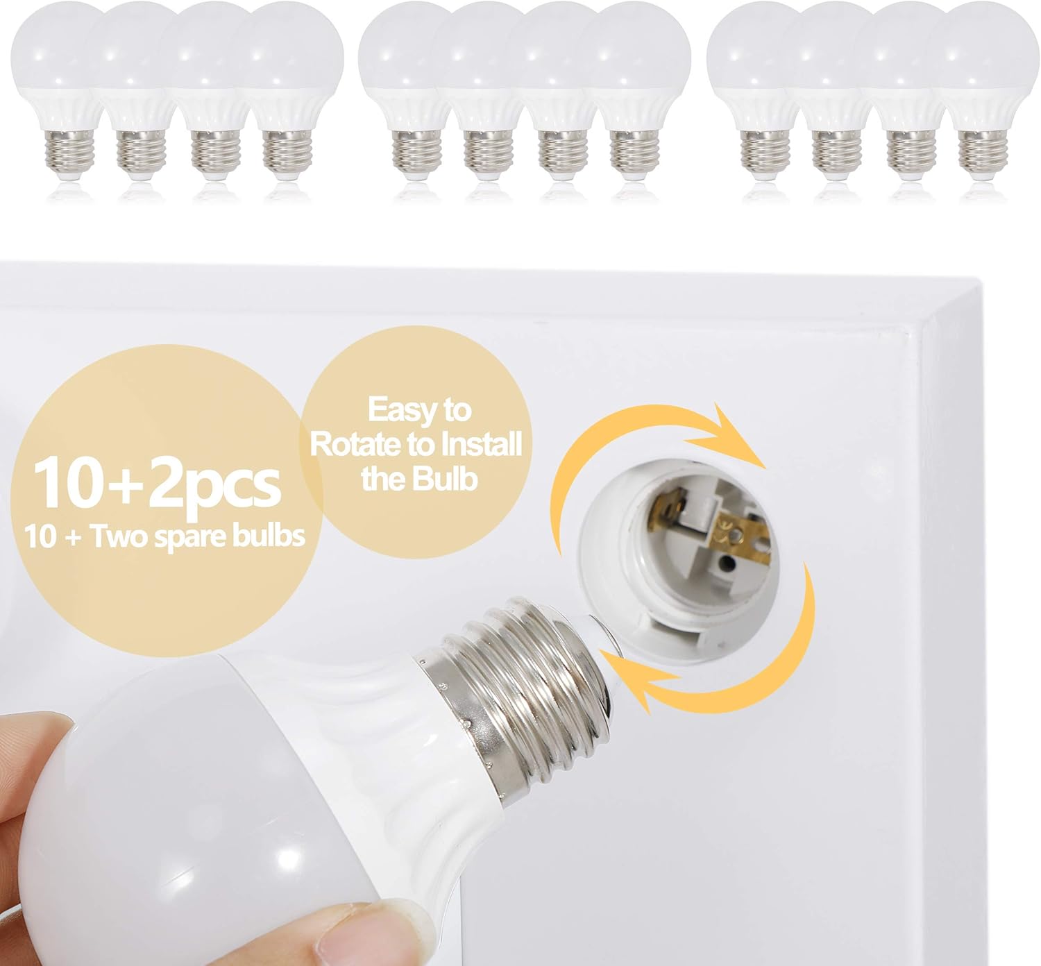 【Adjustable Brightness & 3 Colors Lights】- It comes with 12 high brightness dimmable LED bulbs with a 50,000 hour life span and includes 2 additional bulbs for replacement. The lighting is dimmable with the side adjustable knob for brightness and colour, from cool white, natural light to soft light.