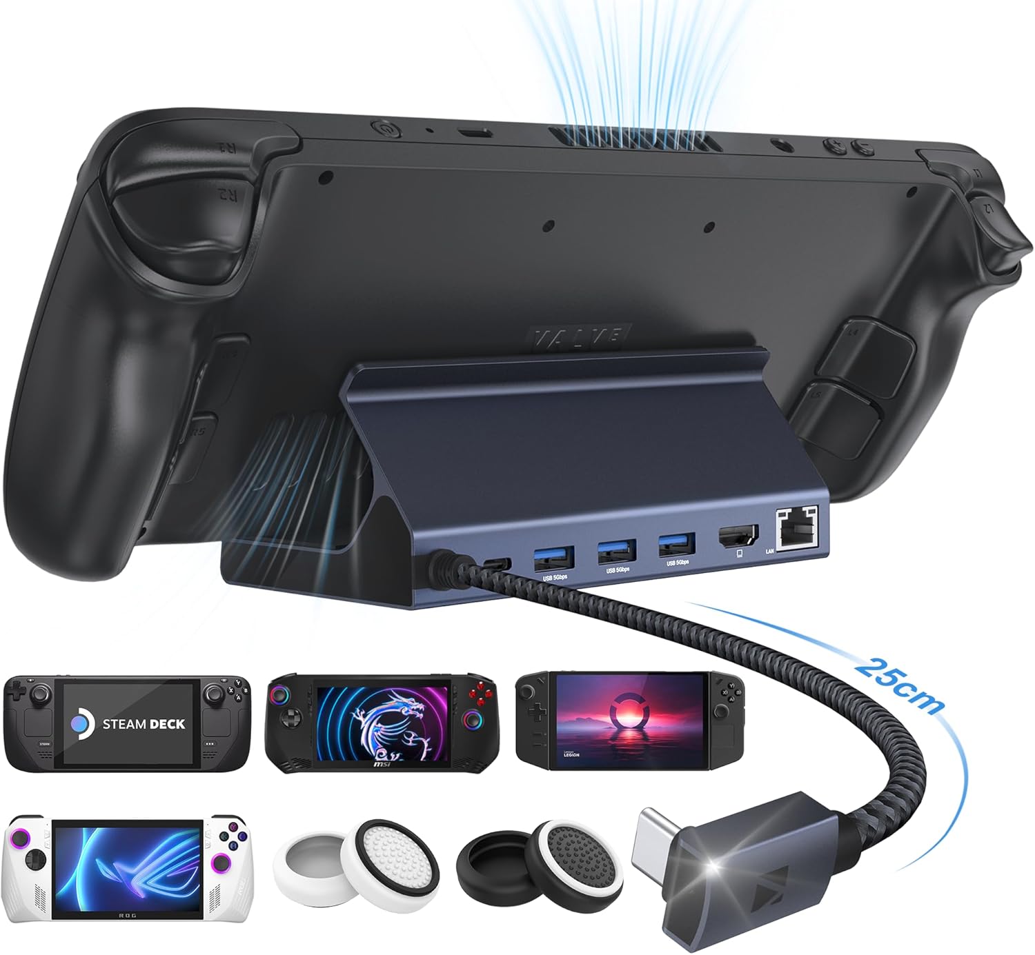【Estación de acoplamiento de juegos 8-en-1】Este dock Steam Deck OLED cuenta con una conectividad definitiva de 6-en-1. Con un puerto HDMI 4K@144Hz, un puerto Ethernet 1Gbps, tres puertos USB-A 3.0 de 5Gbps y un puerto USB-C de carga rápida, este dock puede complementar perfectamente tu consola de juego Type-C. Las dos tapas de joystick equipadas protegen tus joysticks del roce y arañazos externos