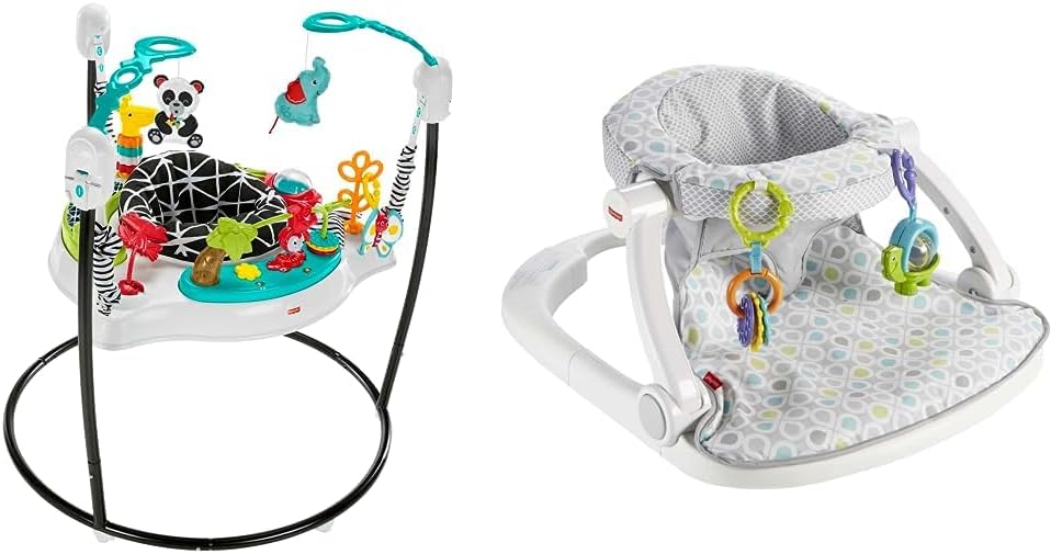 Fisher-Price Baby Bouncer Animal Wonders Jumperoo Activity Center With Music Lights Sounds And Developmental Toys​Your baby will love exploring all the hands-on fun of this Fisher-Price Animal Wonders Jumperoo activity center. The rotating seat gives little ones 360-degree access to toys, activities, and animal pals, including a roller ball, bead bar, teether, mirror, and so much more. As your tiny explorer discovers all the fun, their every jump is rewarded with playful music, lights, and sounds. Max. weight 25 lb/ 11,3 kg. Use only with a child who can hold their head up unassisted and who is not able to walk or climb out of the product.Fisher-Price Portable Baby Chair Sit-Me-Up Floor Seat With Developmental Toys & Machine Washable Seat Pad, Honeydew DropThe Fisher-Price Sit-Me-Up Floor Seat is cute, convenient, and it helps support baby as you sit them up to interact with the world around them. The soft fabrics and wide base help little ones relax in cushy comfort. Plus, it folds flat for easy storage or travel seating. Your baby will love playing with the linkable toys, and you'll love how easy it is to clean: just remove the seat pad and pop it in the washing machine! Max weight 25 lb/11,3 kg. Use only with a child who is able to hold head up unassisted and who is not able to climb out or walk.