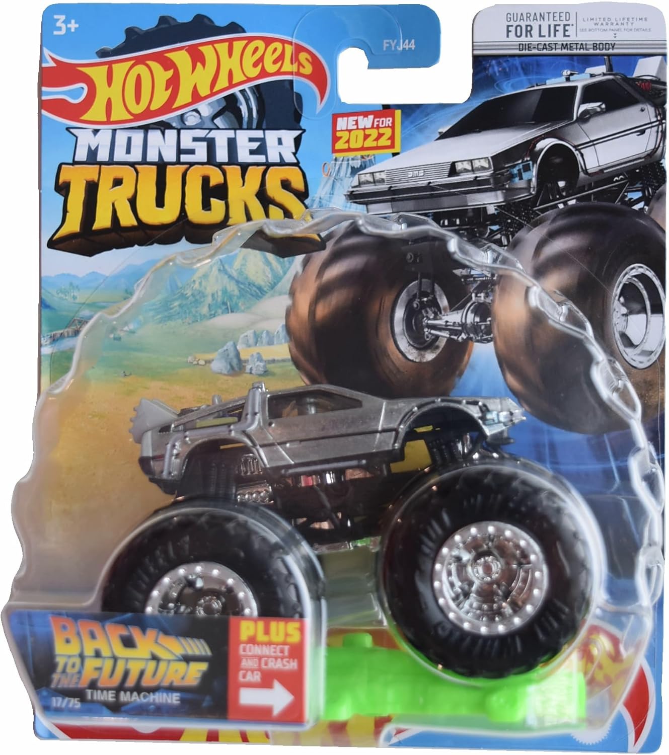 Hot Wheels Monster Trucks Regreso al Futuro Máquina del Tiempo, Coche Conecta y Choca