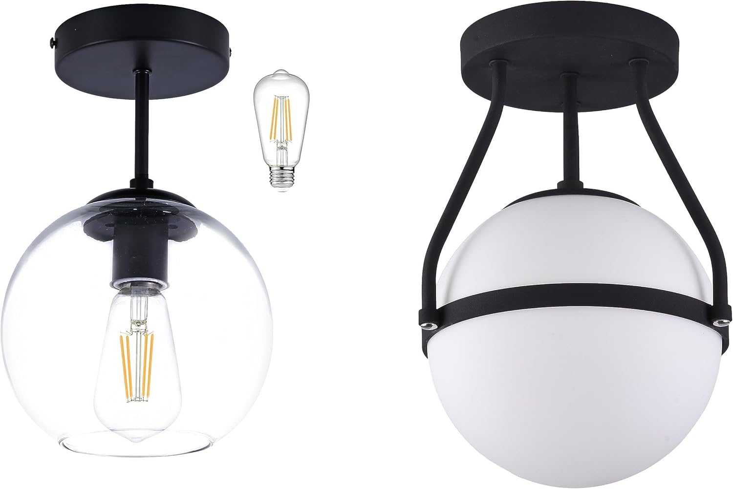 Black Semi Flush Mount Ceiling Light Fixture with Clear Glass Light Fixture&Globe Ceiling Light Fixture with Milk Glass Shade Matte Black Finish for Kitchen Island Hallway Laundry(Bulb Incl)