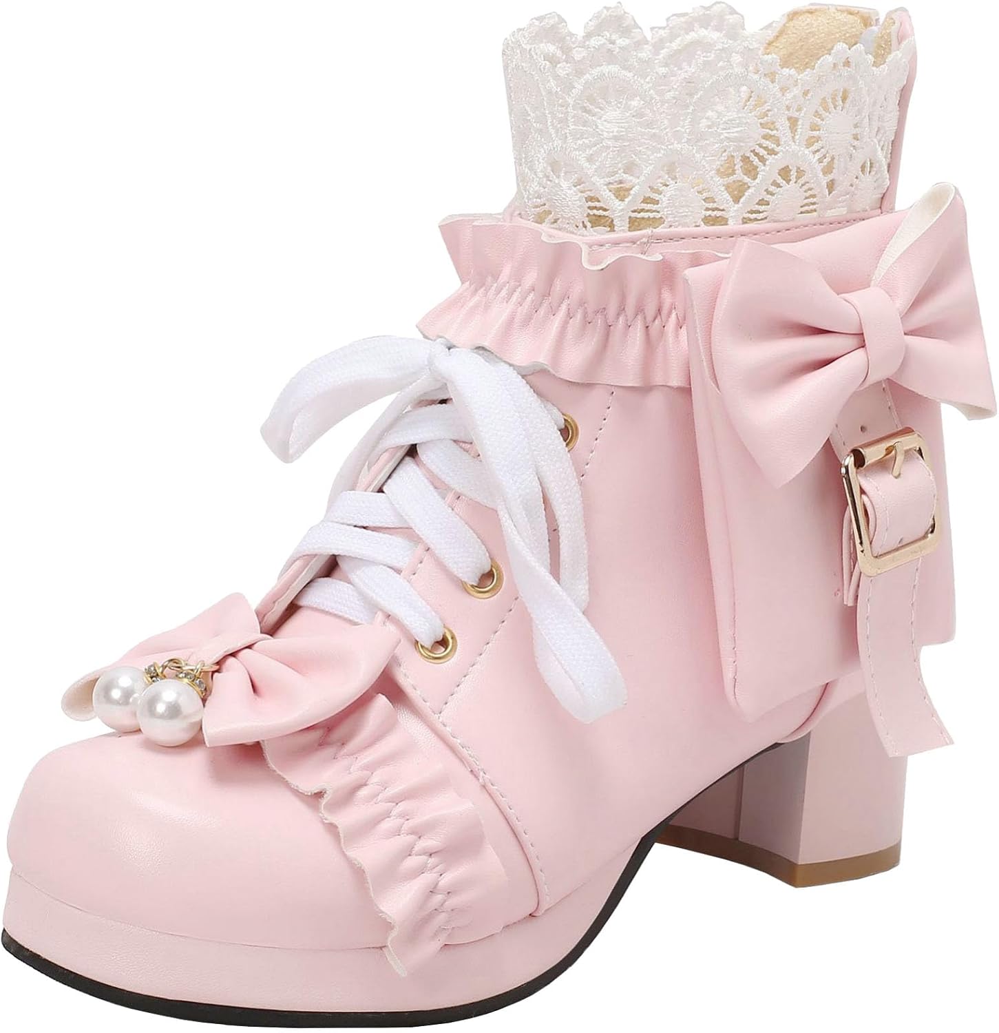 LUXMAX Women Chunky Heel Lace Up Booties Lolita Kawaii Shoes Block Heel Cute Ankle Boots Sweet Lace Boots with Bow