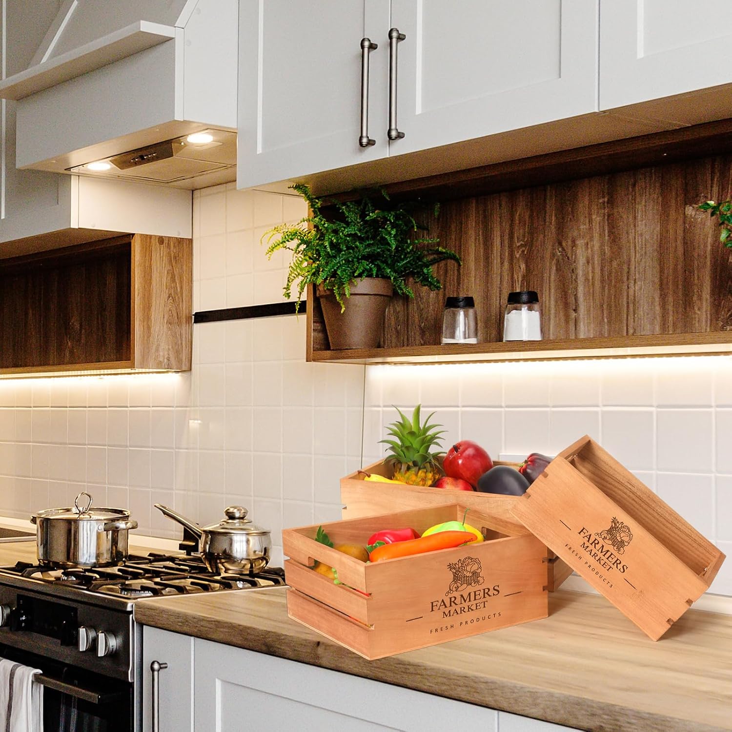 Features: Deriving the utility and style from our versatile wood vegetable crate, with stackable and nestable features, the crate offers a storage way as efficient as it is aesthetic, reveling in the beauty of nature's gifts as the crate enrich your living spaces. Wood fruit crates are sturdy and reliable, not easy to break or tear, you can also share with your friends and families, they will feel your care and love. Specifications: Material: woodColor: as the pictures shownSize: Size 1: about 14.8 x 11 x 6.1 inchesSize 2: about 13.2 x 9.4 x 5.5 inchesSize 3: about 11.6 x 7.9 x 4.9 inchesSize 4: about 10 x 6.3 x 4.3 inchesSize 5: about 8.5 x 4.7 x 3.7 inchesPackage includes: 5 x Wooden cratesNotes: Manual measurement, please allow slight errors on size. The color may exist a slight difference due to different screen displays.