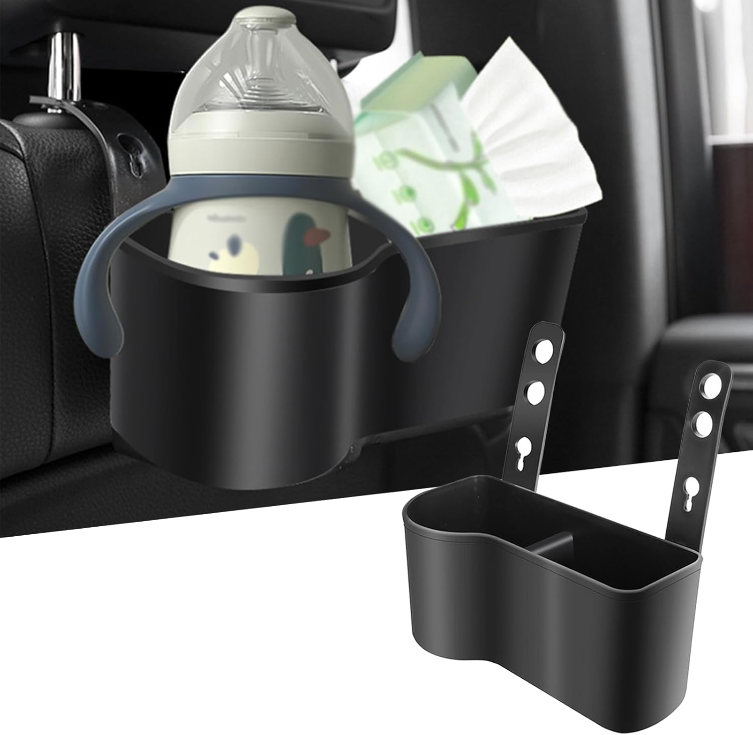 Product Details: The package includes 1 x black seat hanging storage rack. The product size is 7.8" x 3.1" x 3.1". There are two compartments, and a specially designed cup holder. The water cup is not easy to spill when placed in it, and it is firmly fixed.