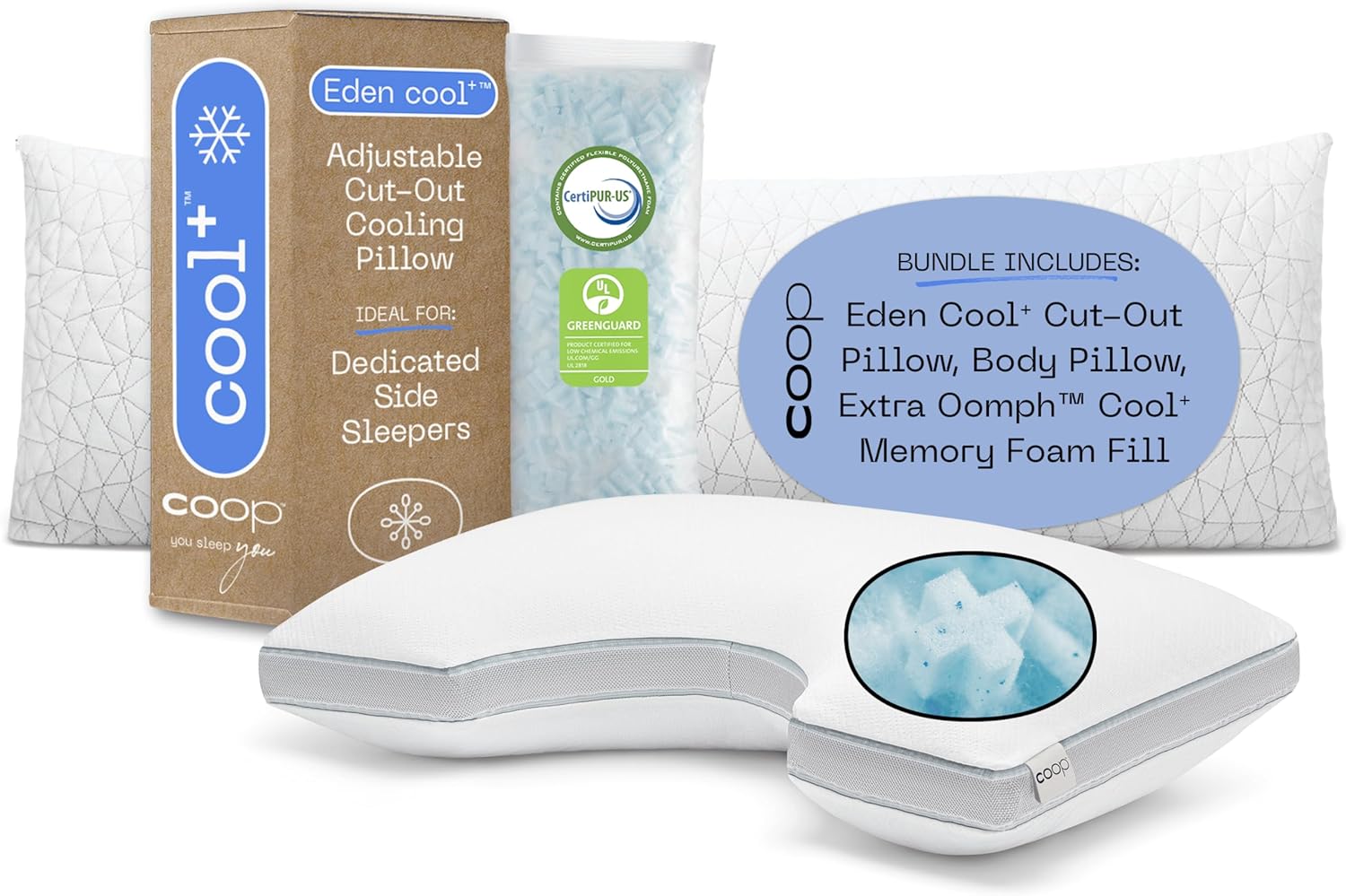 Hot Side Sleepers Rejoice: Introducing our coolest bundle for side sleepers yet, the Cool+ Cut-Out and Body Pillow bundle. Beat the heat and say goodbye to night sweats, hot flashes, neck pain, migraines, headaches, discomfort, and sleepless nights. Coop's Cool+ Cut-Out pillow is thoughtfully designed for hot, dedicated side sleepers to help you beat the heat & give you the coolest sleep, while our Body pillow is designed to deliver the ultimate comfort with the support of a full body