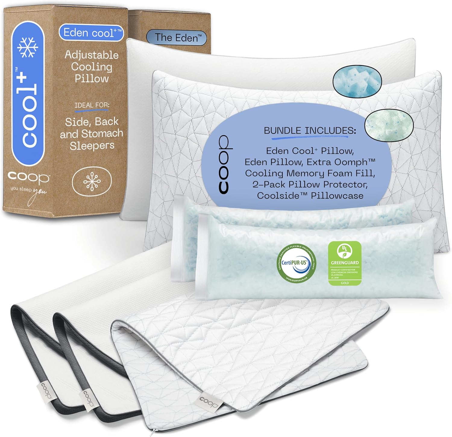 A hot sleeper’s dream bundle: Hot sleepers, we’ve got the perfect pillow bundle for you, our Cool+ Pillow and Eden Pillow, Protector & Pillowcase bundle. Coop's Cool+ pillow is thoughtfully designed for hot sleepers to help you beat the heat & give you the coolest sleep, while the Eden Pillow is designed for those nights when you’re not so hot but still want a cool and refreshing sleep with customizable support and comfort. Protect and extend the life of your pillows by preventing stai