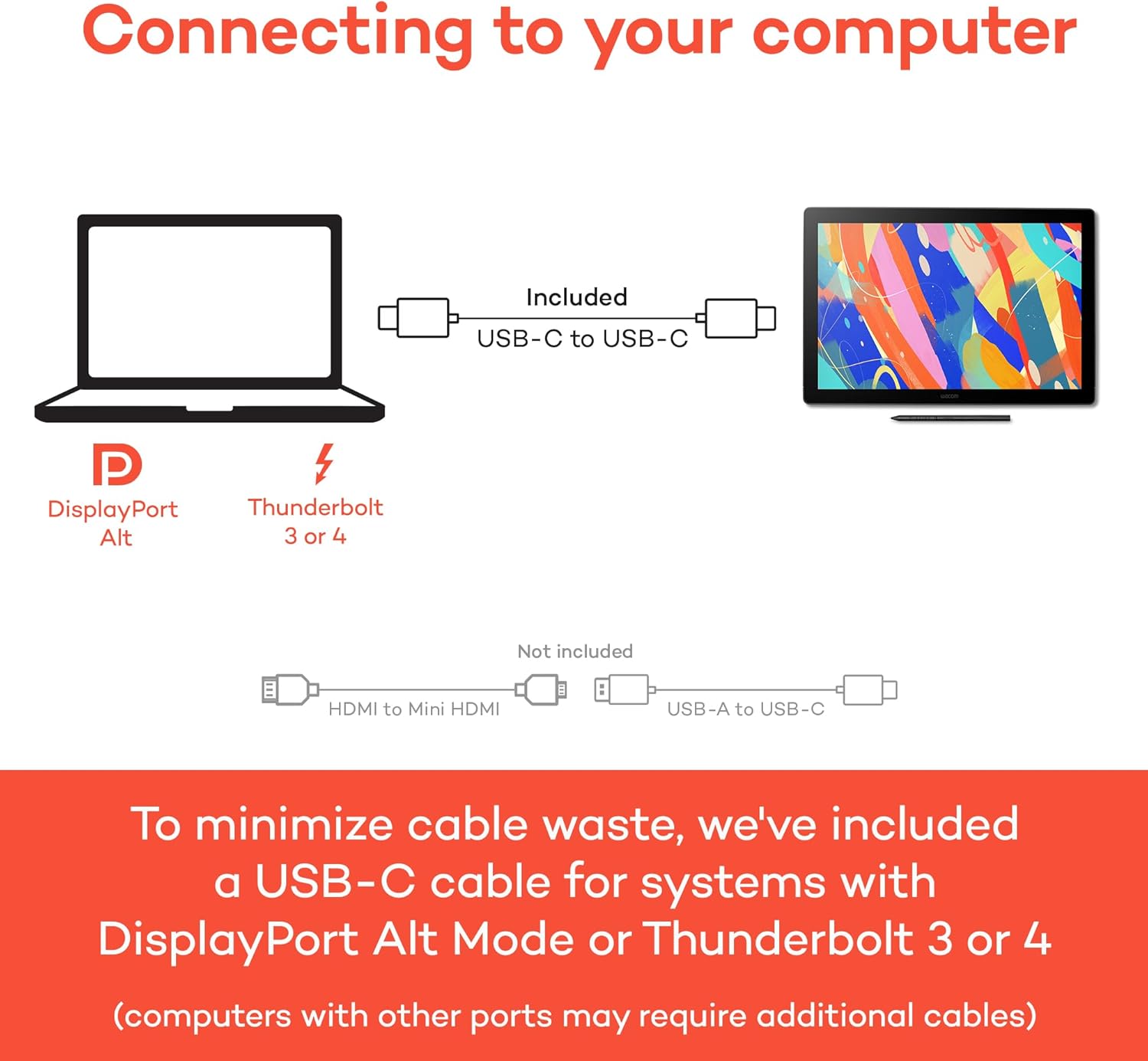 CONNECTION: includes USB-C cable to connect to Windows/Mac computers with DisplayPort Alt Mode or Thunderbolt 3 or 4 input (computers without DP Alt or TB 3 or 4 input require additional cables)