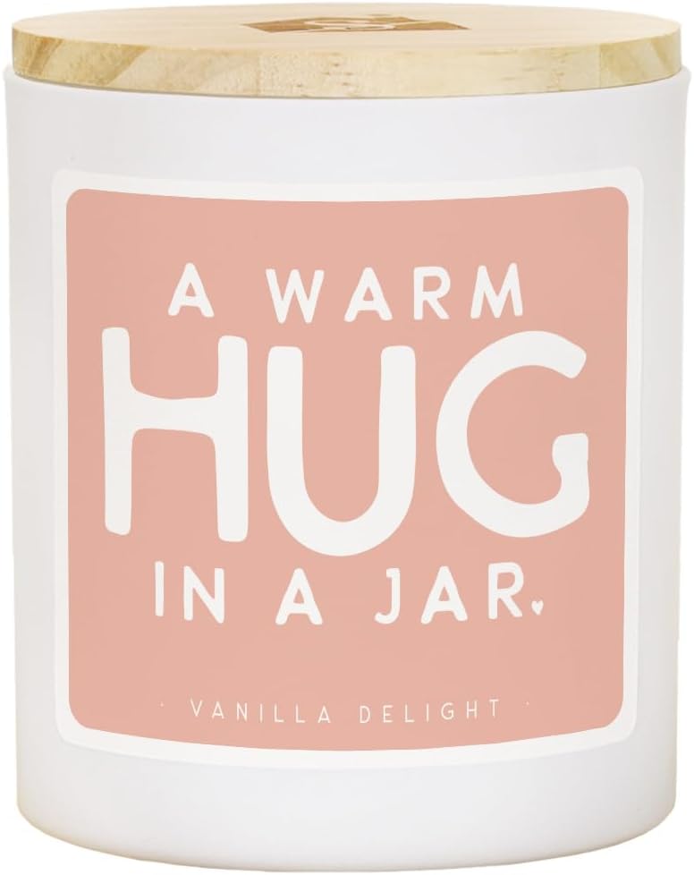 HUG IN A JAR CANDLE - Cute candle reads "A Warm Hug In A Jar." This two wick, 11 oz soy vanilla candle makes a thoughtful gift, get well soon candle, friendship candle or anytime gift.