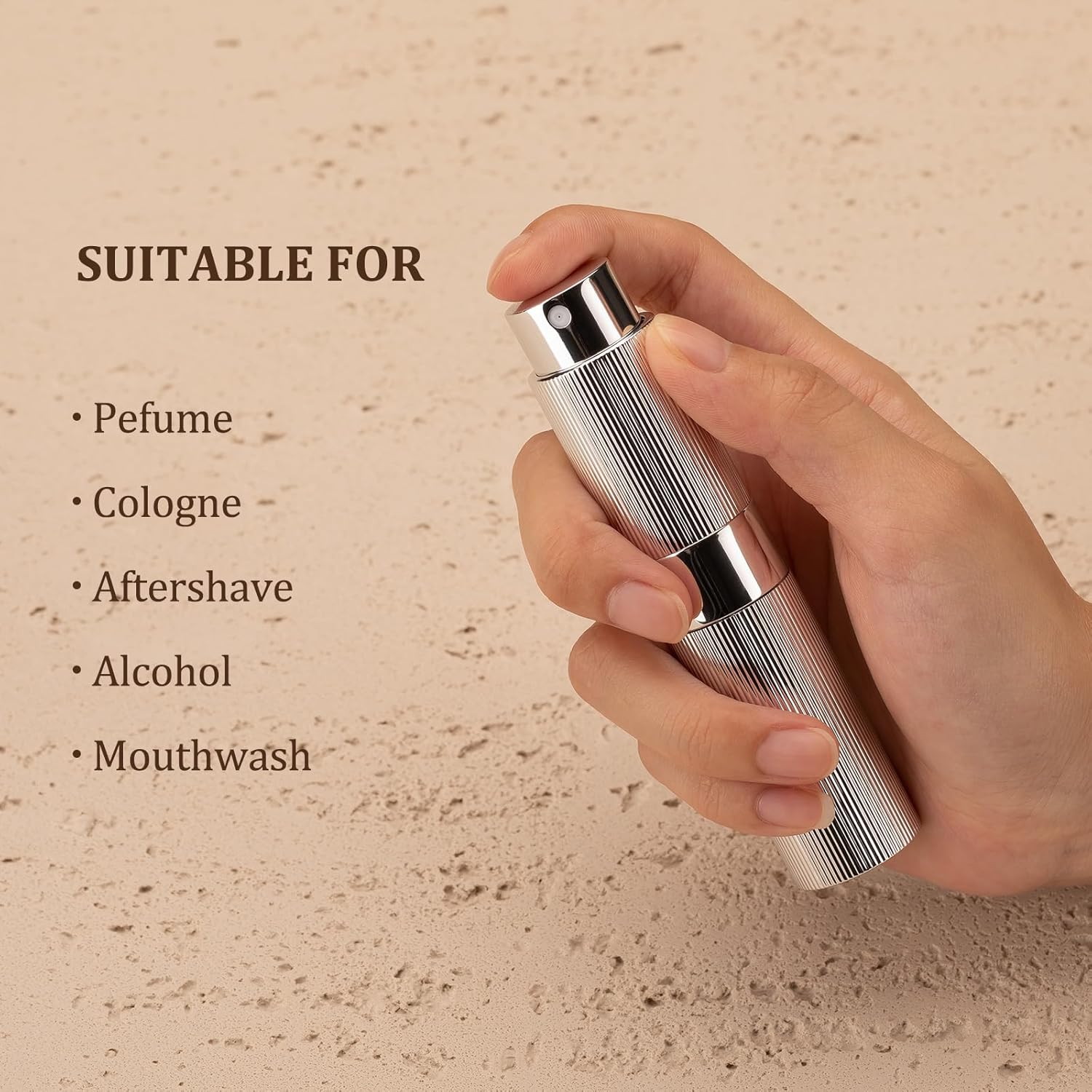 【New Design】Our travel perfume bottle features a sleek, striped design that elevates its elegance. The refillable atomizer boasts an innovative twist up pump for easy use and a fine mist. Its durable aluminum case and glass interior provide superior protection, making it less prone to breakage.