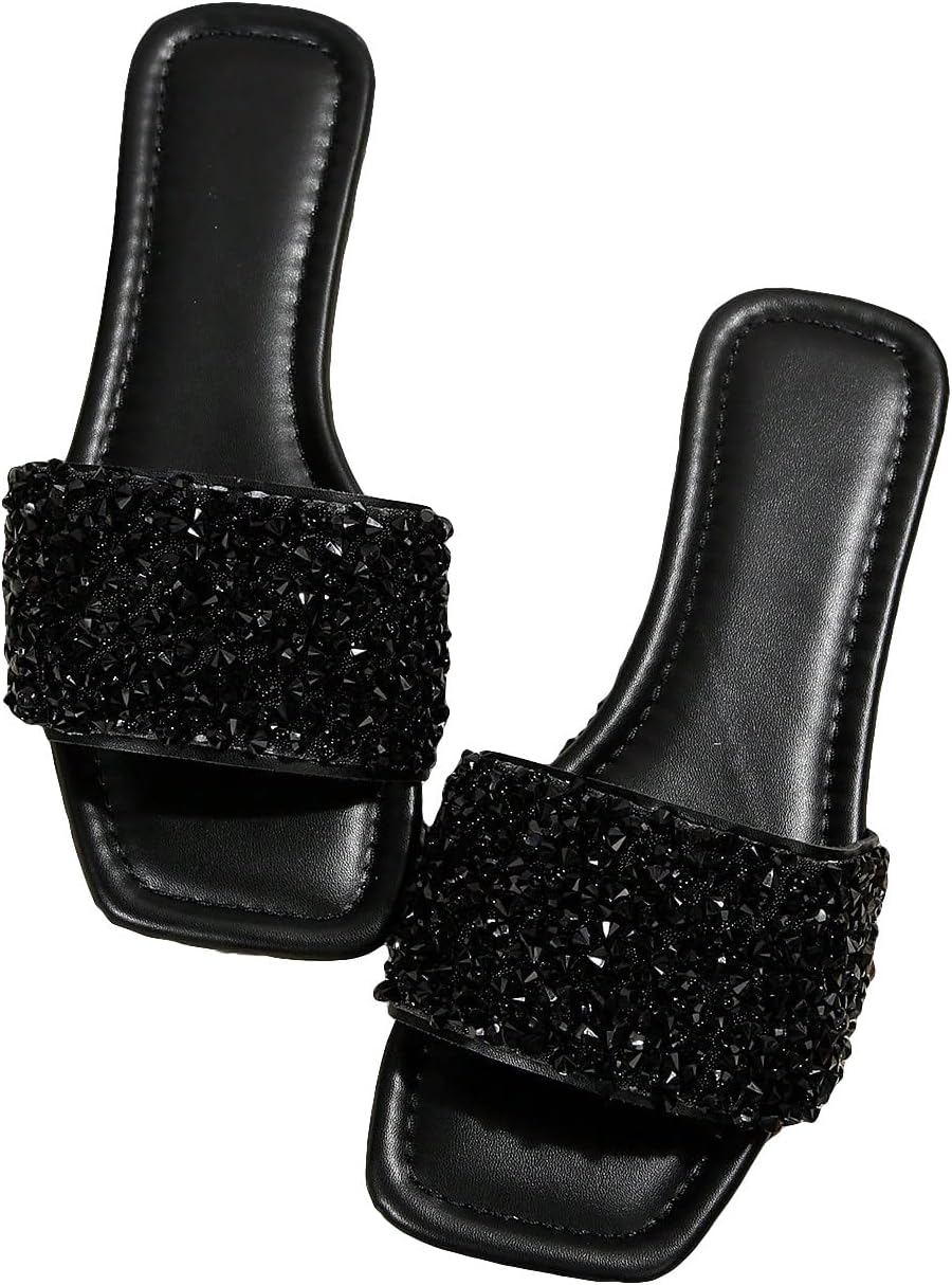 GORGLITTER Women's Sparkly Jeweled Flat Sandals Dressy Open Toe Glitter Shiny Slippers Slip-on Shoes