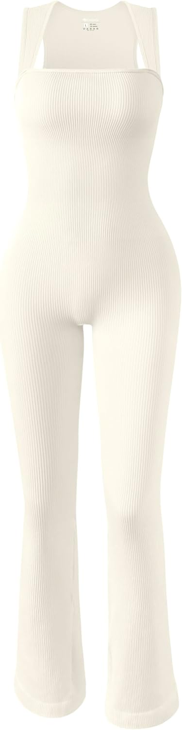 OQQ Women Yoga Jumpsuits Ribbed Strappy Sleeveless Tank Tops Exercise Bell Bottoms Flare Jumpsuits Beige