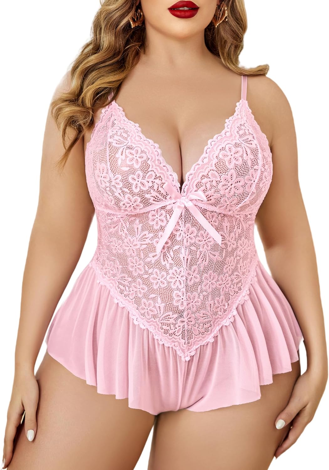 Avidlove Plus Size Lingerie for Women Lace Bodysuit One Piece Teddy Babydoll Mesh Chemise V Neck Sleepwear L-5XL
