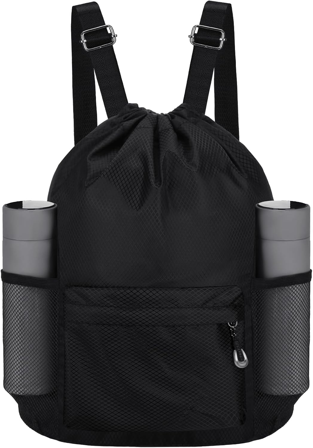 Waterproof Drawstring Bag, Lightweight String Backpack with Water Bottle Holder and Pockets, Gym Sports Cinch Sackpack (Black)