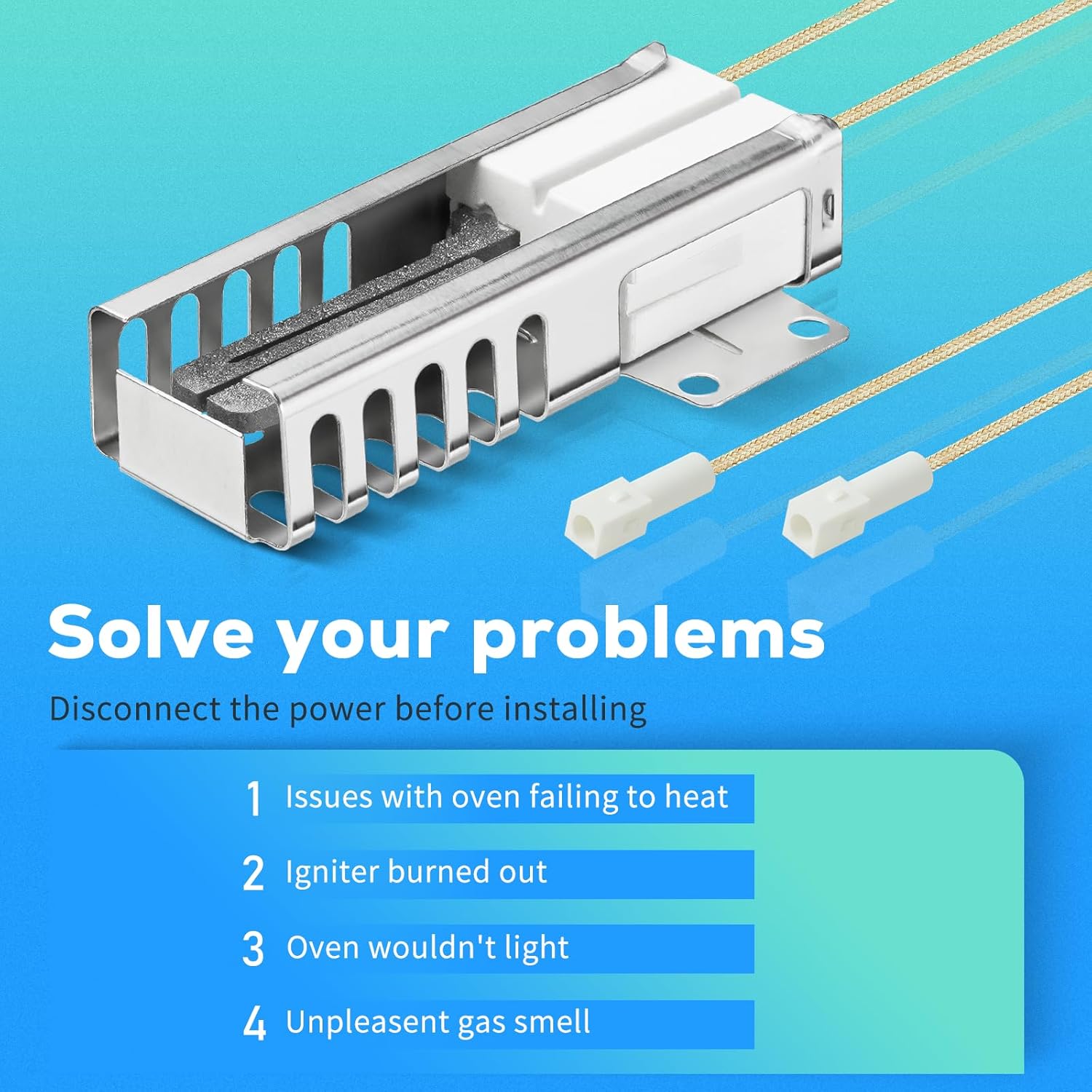 >>>> SOLVE YOUR PROBLEMS: 1.AP5967723 gas stove igniter will solve the problems about the oven not heating or heating abnormally, 2. Oven running erratically, 3. Igniter was burned out and gas smell etc. For your safe, please shut off the house circuit breaker and gas supply before installing this part. Wear work gloves to protect your hands