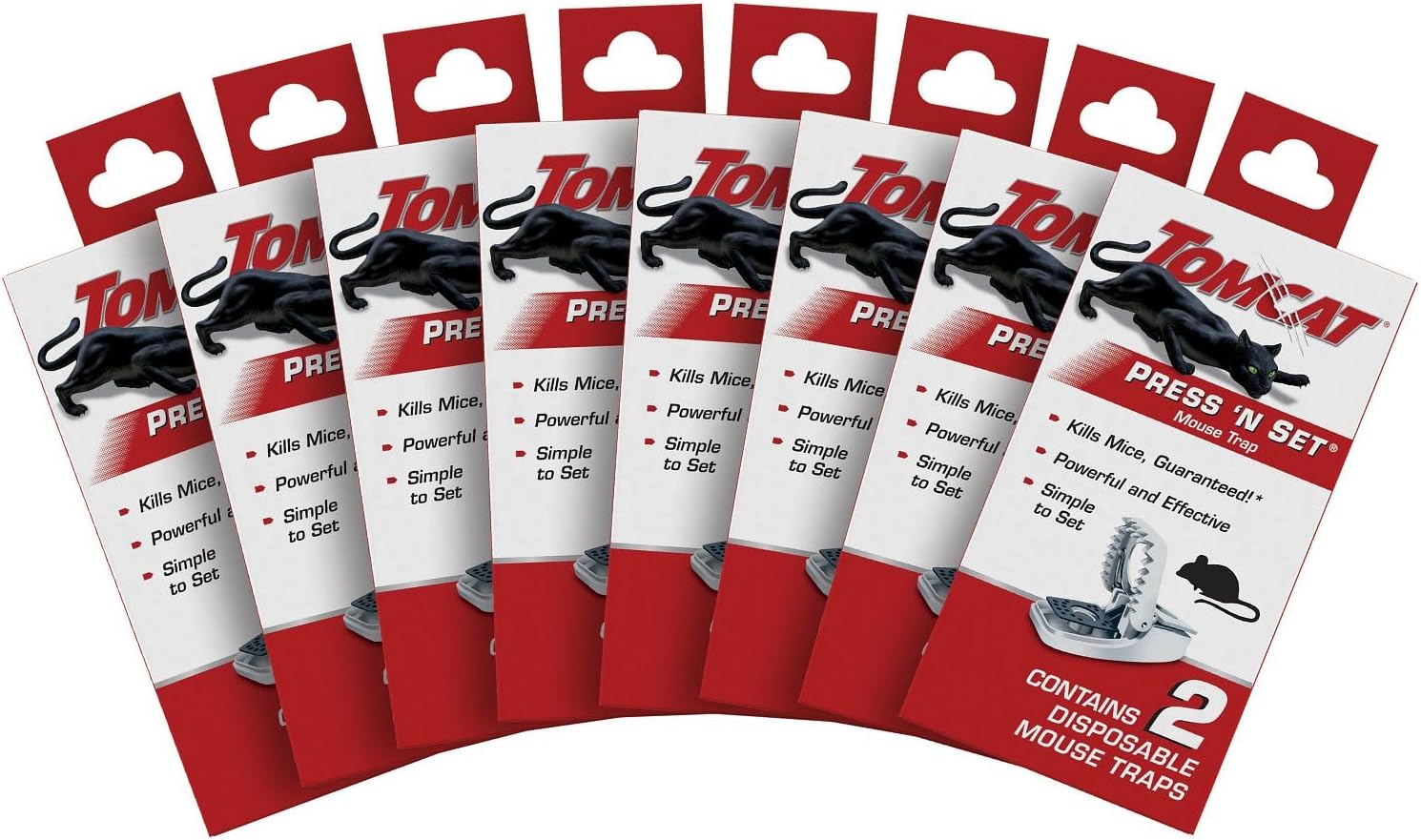 All it takes is one simple set. The Tomcat® Press 'N Set® Mouse Trap is guaranteed* to kill mice and allows for easy, no-touch disposal. These plastic, spring-loaded snap traps are easy to set and reduce the risk of pinched fingers. To use, place a pencil eraser-sized dollop of food such as peanut butter into the bait well. After baiting, pull the set bar back the entire way until you hear a "click" to tell you it is locked. Mice have a natural tendency to run along walls as they move from hiding to feeding, so we recommend placing traps with the bait well facing the walls of rooms or cupboards where activity is suspected, such as kitchens, utility rooms, or garages (droppings and oily marks along baseboards are a telltale sign of activity). Once the mouse has been killed, pick up the trap using the grab tab and dispose of the trap and the mouse in the trash. Your fingers will never touch the dead mouse! This package of Tomcat® Press 'N Set® Mouse Trap contains 16 disposable mouse traps. *Tomcat Brands Guarantee: If for any reason you, the consumer, are not satisfied with this product, mail us your original proof of purchase to obtain a full refund of your purchase price.