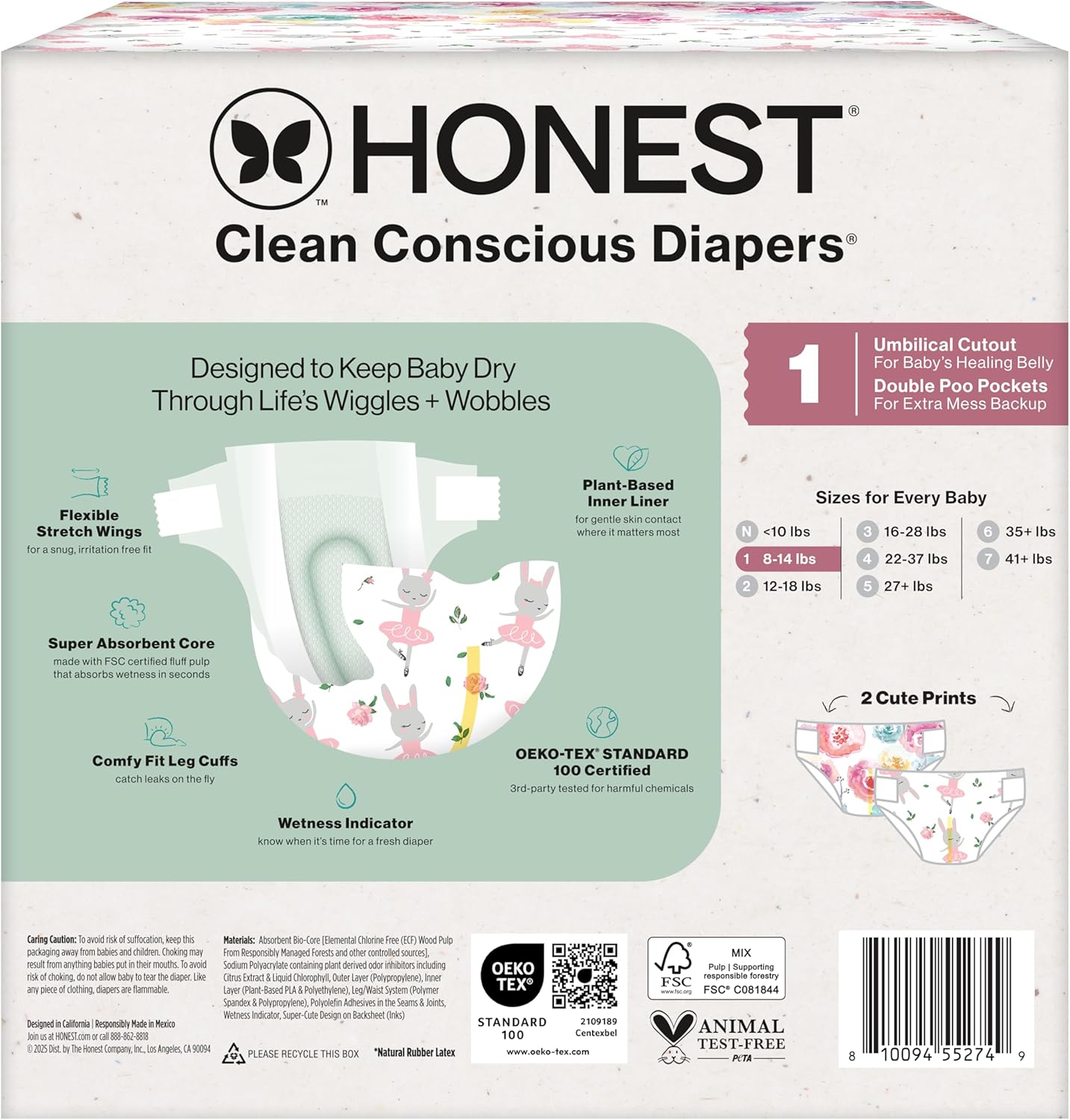 The Honest Company Clean Conscious Diapers for Delicate Skin, Up to 100% Leakproof Hypoallergenic Fragrance-Free Baby Diapers, Girl Prints, Club Box, Size 1 (8–14 lbs), 78 Count (Prints May Vary)
