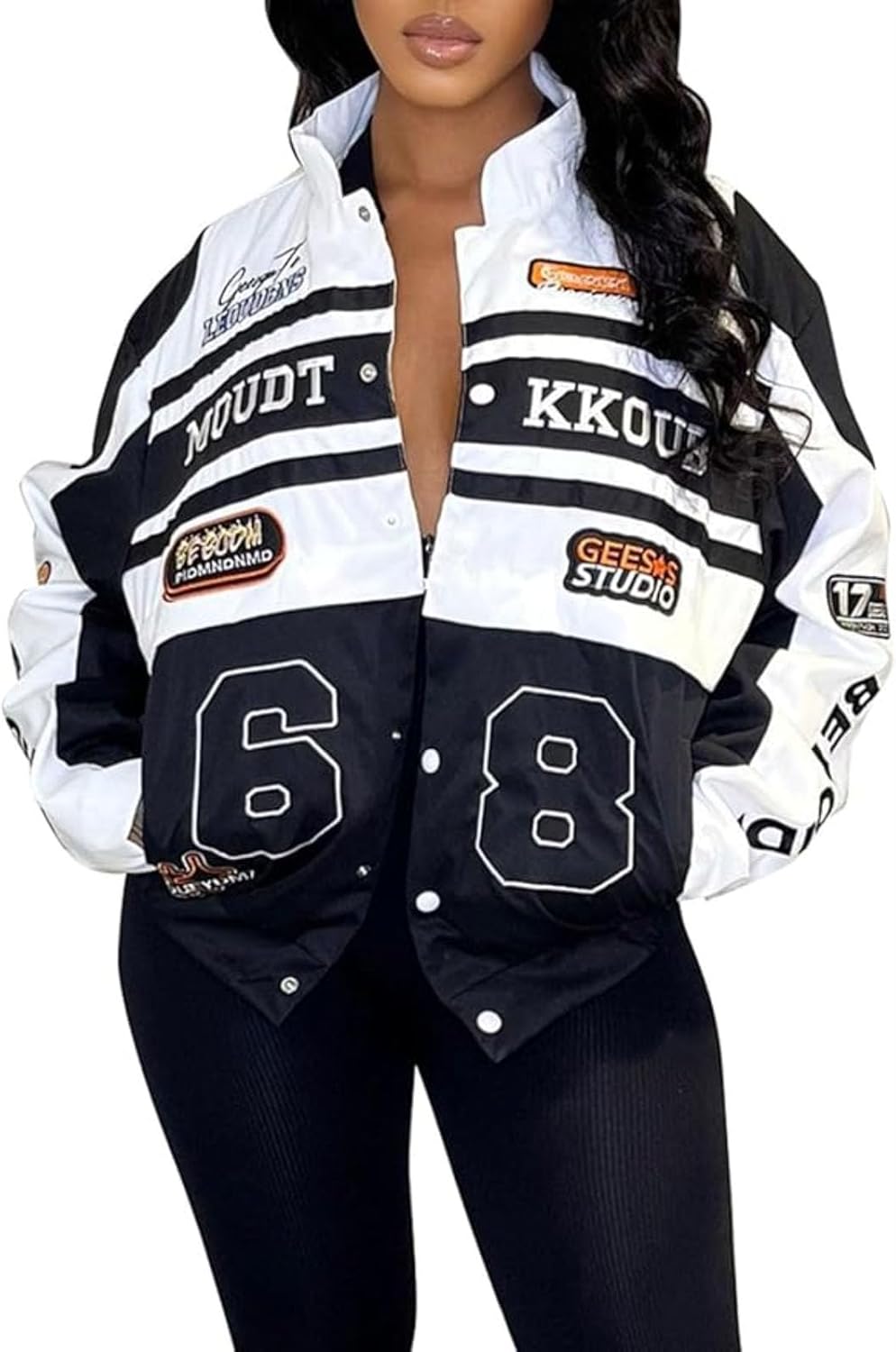 Varsity Letterman Jacket - Vintage Racing Bomber Motorcycle Women's Cropped Detachable Streetwear (Black, XXL, XX-Large)