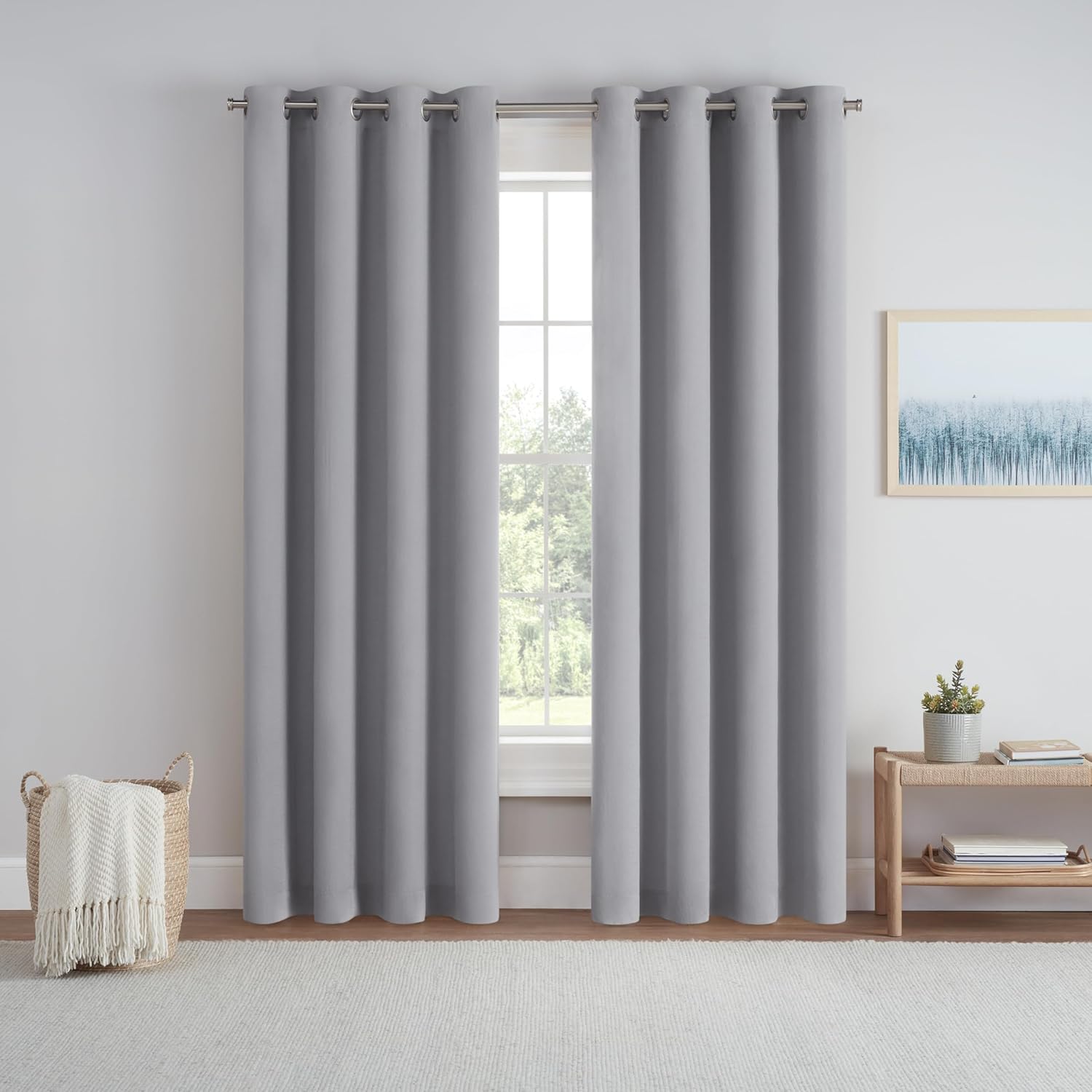 Find the perfect combination of style and function with the Eclipse Dutchess Solid 100% Blackout Lined Sheer Grommet Curtains. Our blackout curtains provide privacy, manage light, reduce noise, and help with energy savings while bringing a fashionable look to your home décor. Block out unwanted light with the textured sheer fabric lined with 100% Blackout liner, an ideal solution for your bedrooms, media rooms, or anywhere where light could be seen as a distraction. The Thermalayer curtains feature multiple layers of thermal fabric to combine Eclipse technology and design that helps keep the summer heat and winter chill out of your home and maximize comfort, giving you a superior night’s sleep. Each lined panel measures 84" x 50". The 1.5" metal grommets make it easy to open and close your curtain panel and are recommended to be paired with a 1.25" rod for maximum movement. Curtain rod sold separately. Our 100% Polyester curtains are machine washable. Discover Eclipse Curtains, our comprehensive family of functional window treatments provides privacy, manages light, reduces noise, and helps with energy savings. Design the perfect room environment with solution-oriented curtains without compromising style.