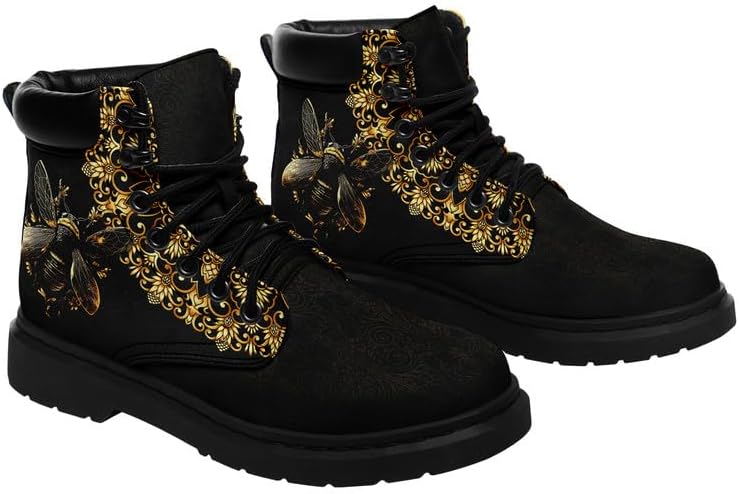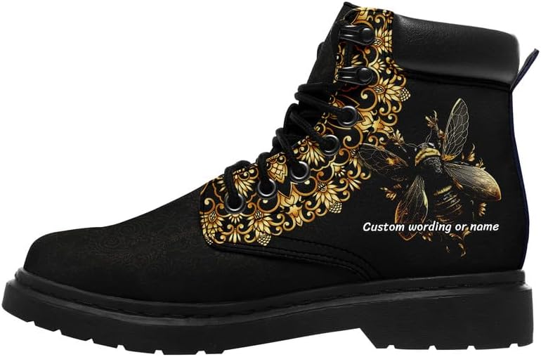 Customizable Women's Ankle Combat Boot with Charming Bee & Floral Design, Stylish Vegan Leather Fashion Booties