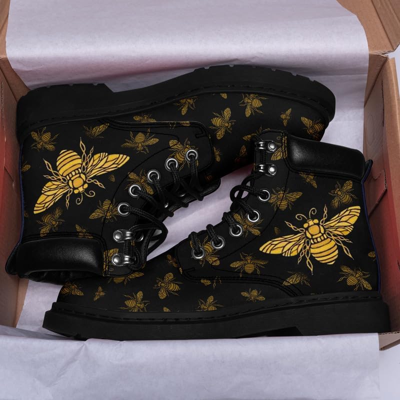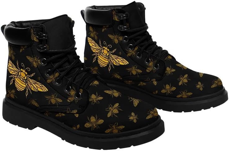 Customizable Women's Ankle Combat Boot with Charming Bee & Floral Design, Stylish Vegan Leather Fashion Booties