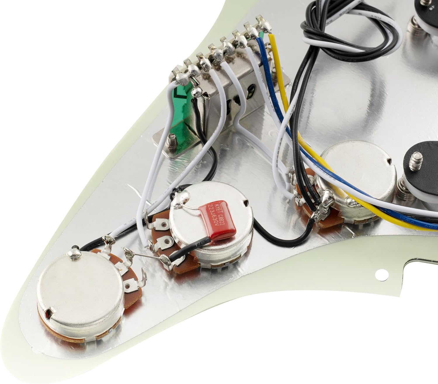Package includes: 1 piece pre-wired pickguard. Pickups (Neck/Middle/Bridge): Resistance is 5.8K/5.8K/7.2K, Magnet: Alnico 5, Polepiece spacing: 50mm/50mm/52mm; Pots: A250K(T) x 2 + B250K(V); Import style 5-way switch; .022µF capacitor; PVC wires