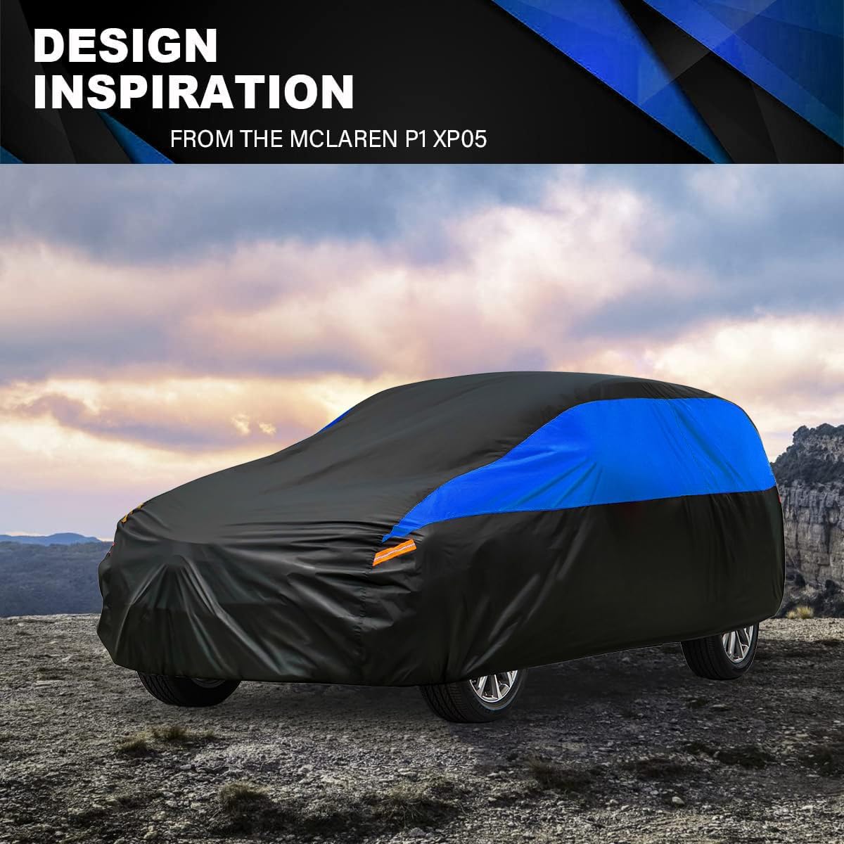 【Unique design】1. 4pcs reflective stripes remind other people in the night, avoid accident in dark environment 2. The elastic hem at the bottom makes the car cover fit the car better 3. Windproof straps can prevent the cover from being blown away by the heavy wind 4. Double stitch technology, it make the fabric stitched tighter, more durable than most similar covers.