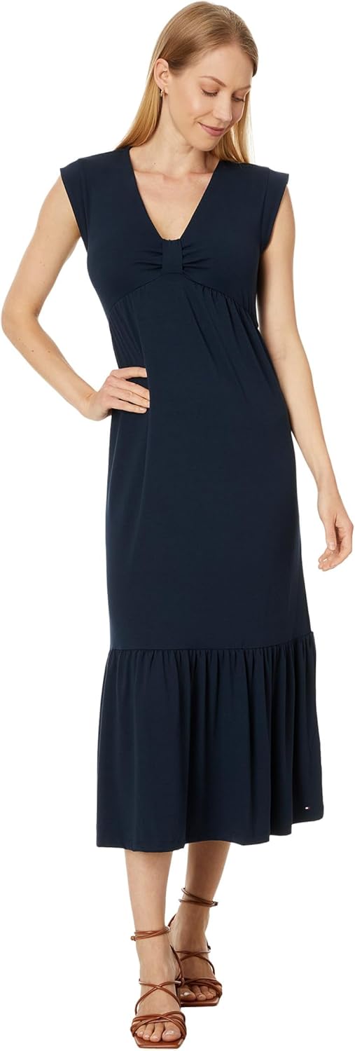 Stay true to the fashion's upbeat wearing Tommy Hilfiger Solid Tiered Midi Dress. It features a bow-inspired bodice with V-neckline, short cap sleeves, and tiered hem designed in an A-line midi silhouette. Pull-on style. 48% polyester, 48% viscose/rayon, 4% elastane/spandex. Machine washable.