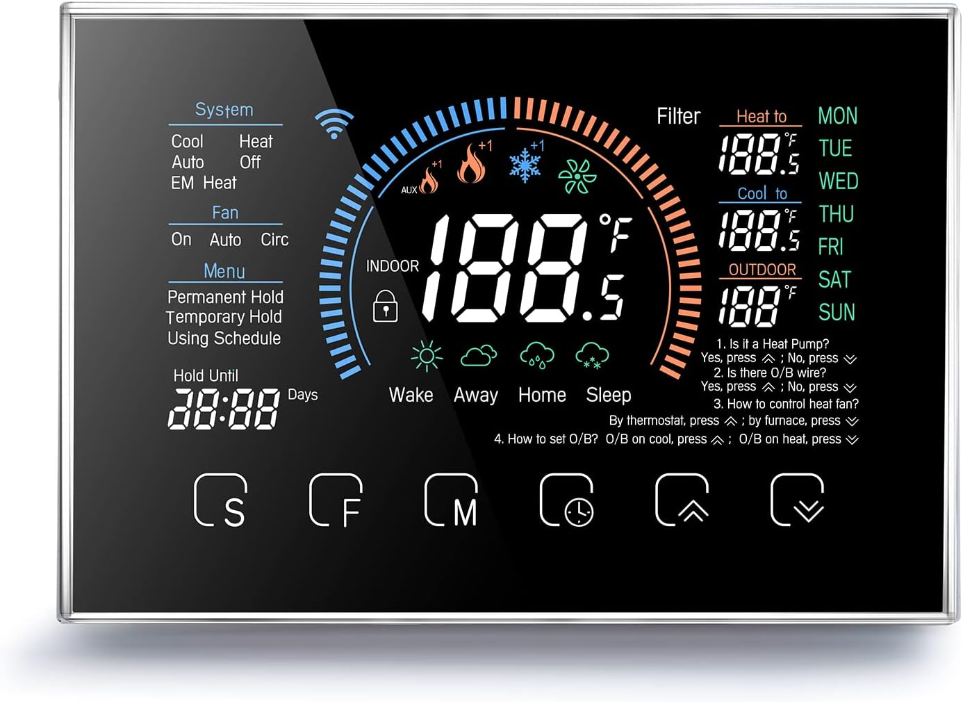 【4.3 Inch Large Full Color Screen】Our programmable thermostat has been equipped with 4.3 inch large full color screen to show information of indoor temp., outdoor temp., target temp., system mode, fan mode, time, weather, and so on, very clear and user-friendly; and 6 touch buttons providing convenient operations.