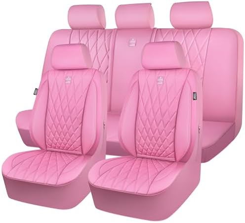 CAR PASS 5 Seats Piping Luxury Leather Seat Covers Full Set, Anti-Slip Waterproof Seat Covers Compatible with Front Armrests, Universal Fit for Suvs,Vans,Trucks,Airbag Compatible, Pure Pink