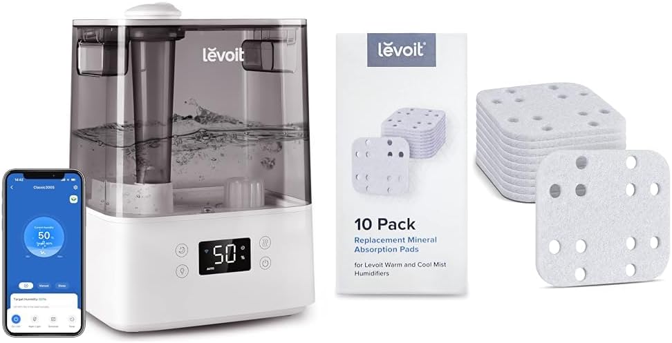 LEVOIT Humidifiers for Bedroom Large Room Home, (6L) Cool Mist Top Fill Essential Oil Diffuser for Baby & Plants, Smart App & Voice Control, Rapid Humidification & Auto Mode - Quiet Sleep Mode, GrayMORE POWERFUL AND SMART GIFTS FOR YOU! Note: Distilled/ purified water is preferred for your health. Specifications: Product Dimensions: 9.6 × 7.5 × 13.4 in / 24.5 × 19.2 × 34 cm Product Weight: 4.3 lb / 2 kg Whisper-Quiet Operation: ≤ 30dB Effective Range: 215–505 ft² / 20–47 m² Material: BPA-free, suitable for babies and adults Features: √ Extra Large Water Tank of 6L √ The operation Lasts Up to 60 Hours, with 7 Nights of Sleep √ Essential Oil Tray √ Free VeSync App and Smart Controls √ Ultra-Quiet Operation √ Night Light √ Zero Light Pollution: The display light can be turned off completely √ 360 Rotating Nozzle √ Automatic Shut-Off Function √ ETL Certified For Safety and Reliability √ It comes with Cleaning Brush TROUBLESHOOTING: The display shows the No Water Indicator incorrectly: 1. Please ensure the arrow above the LED display is aligned with the indicator line on the base to ensure the water tank is properly on the base. 2. Check the max water line to see if there is too much water in the tank and base chamber. Pour out extra water if water is over the max line. 3. Check and clean the Water Outlet Valve. 4. Check whether the Float Brackets rotate smoothly and clean them. WATER FILTER REPLACEMENT: Please search B09ZY9N6PD or Levoit humidifier replacement filter which can extend the life of your humidifier aroma pads REPLACEMENT: Please search B0B8MD45FB or Levoit aroma pads for more information which can help emit a more potent fragrance and protect the fragrance boxLEVOIT Humidifier Replacement Filters 10-Pack, Mineral Absorption Pad, Compatible with LV600S, LV600HH, OasisMist450S, Capture Fine Particles in Water Tank to Improve Humidification Efficiency, WhiteLEVOIT 10 Pack Humidifier Mineral Absorption Pad for LV600S / OasisMist450S / LV600HH Humidifiers Why use: Prevent Stubborn Mineral Buildup and Increase Humidification Efficiency. When to change: Generally last 2-4 weeks (Depending on the hardness of the water). Where to buy: Search B09X9PLMYC or Levoit humidifier replacement filter.