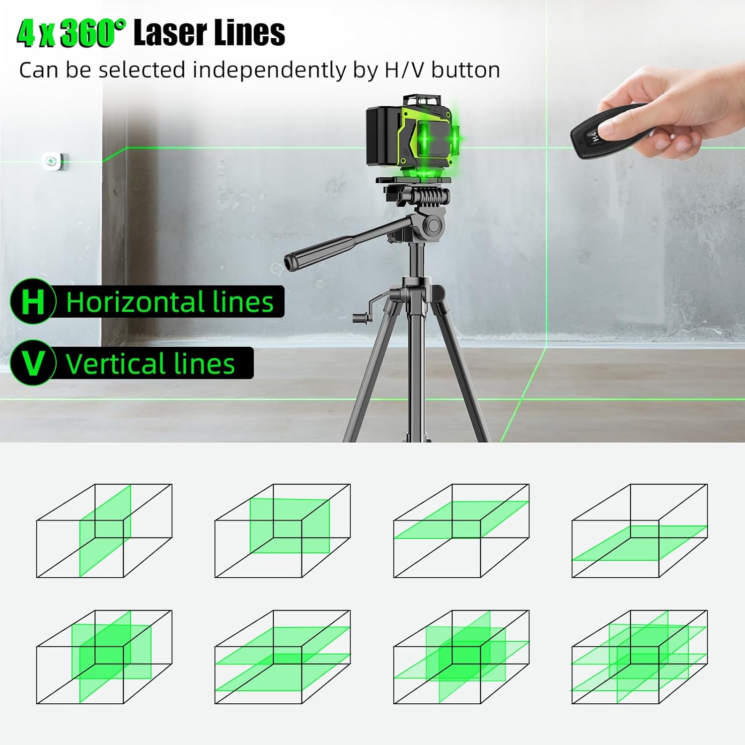 16 Line Laser Level 360 Self Leveling,Professional 4x360°Green Cross Line laser Level Tool for Construction and Picture Hanging,lazer leveler tool with 2 Batteries,Magnetic Bracket & Remote Control