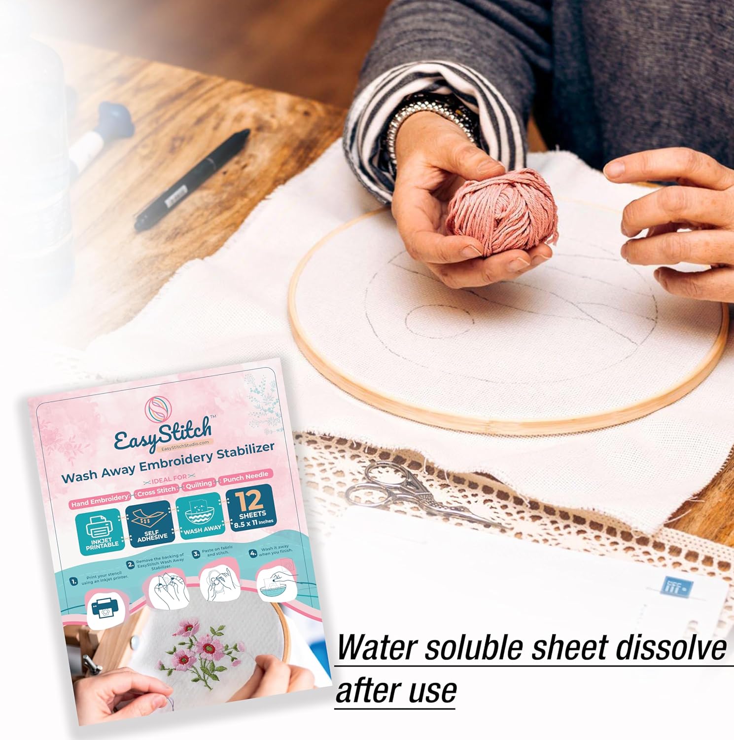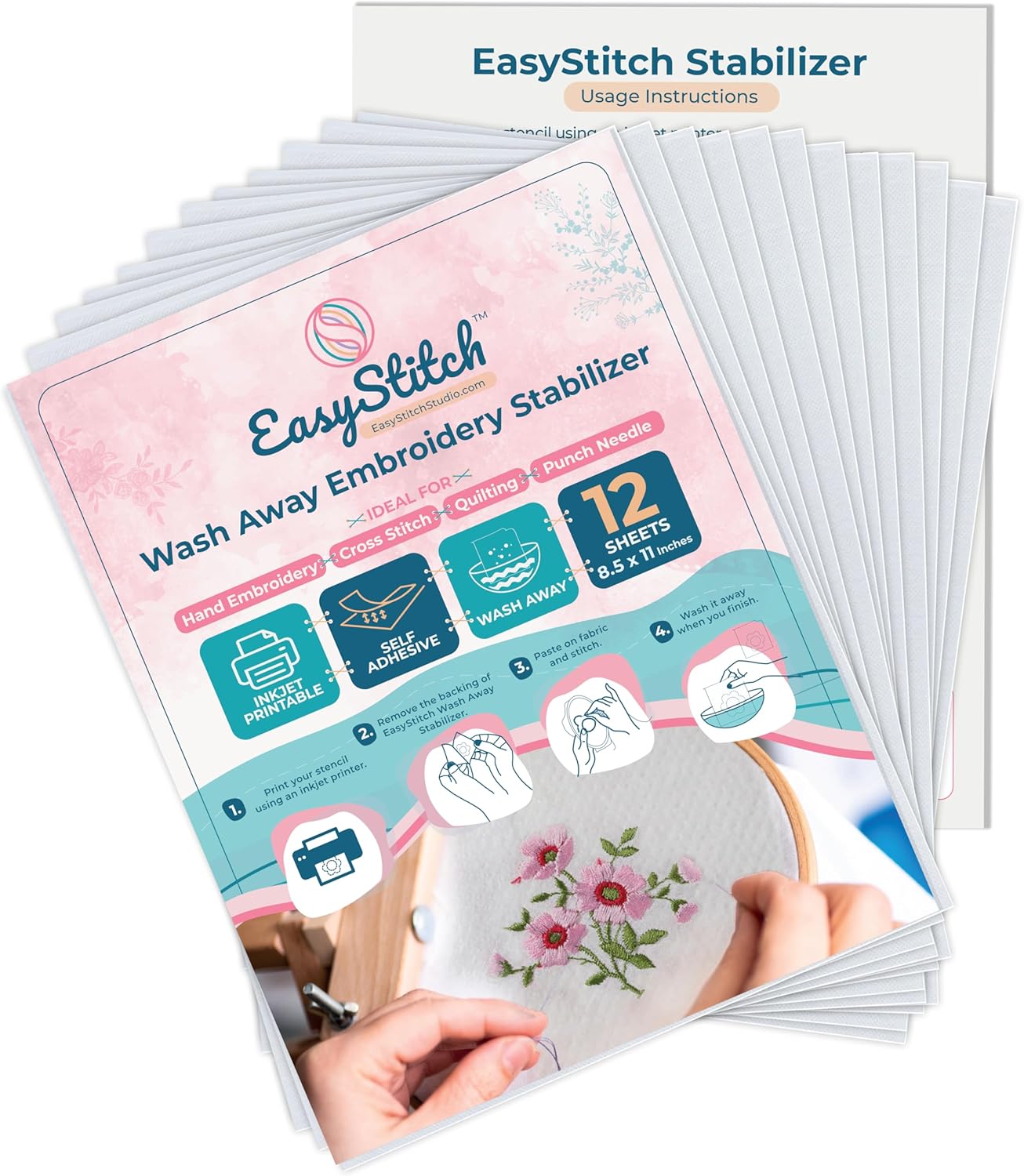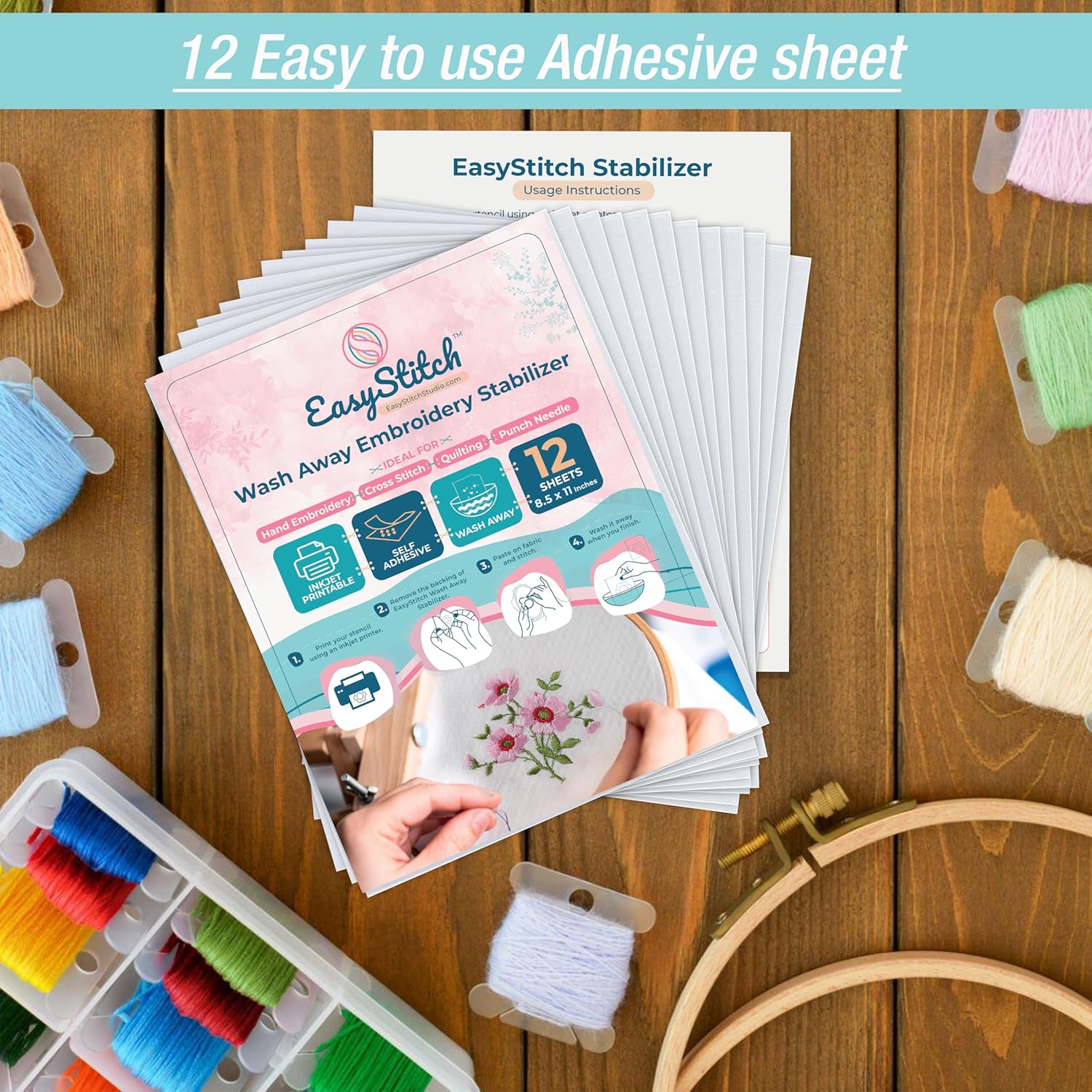 12 piezas de hojas de papel de bordado Stick n Stitch – Estabilizador soluble en agua para bordado de 8.5” x 11” – Estabilizador adhesivo para transferir patrones de bordado