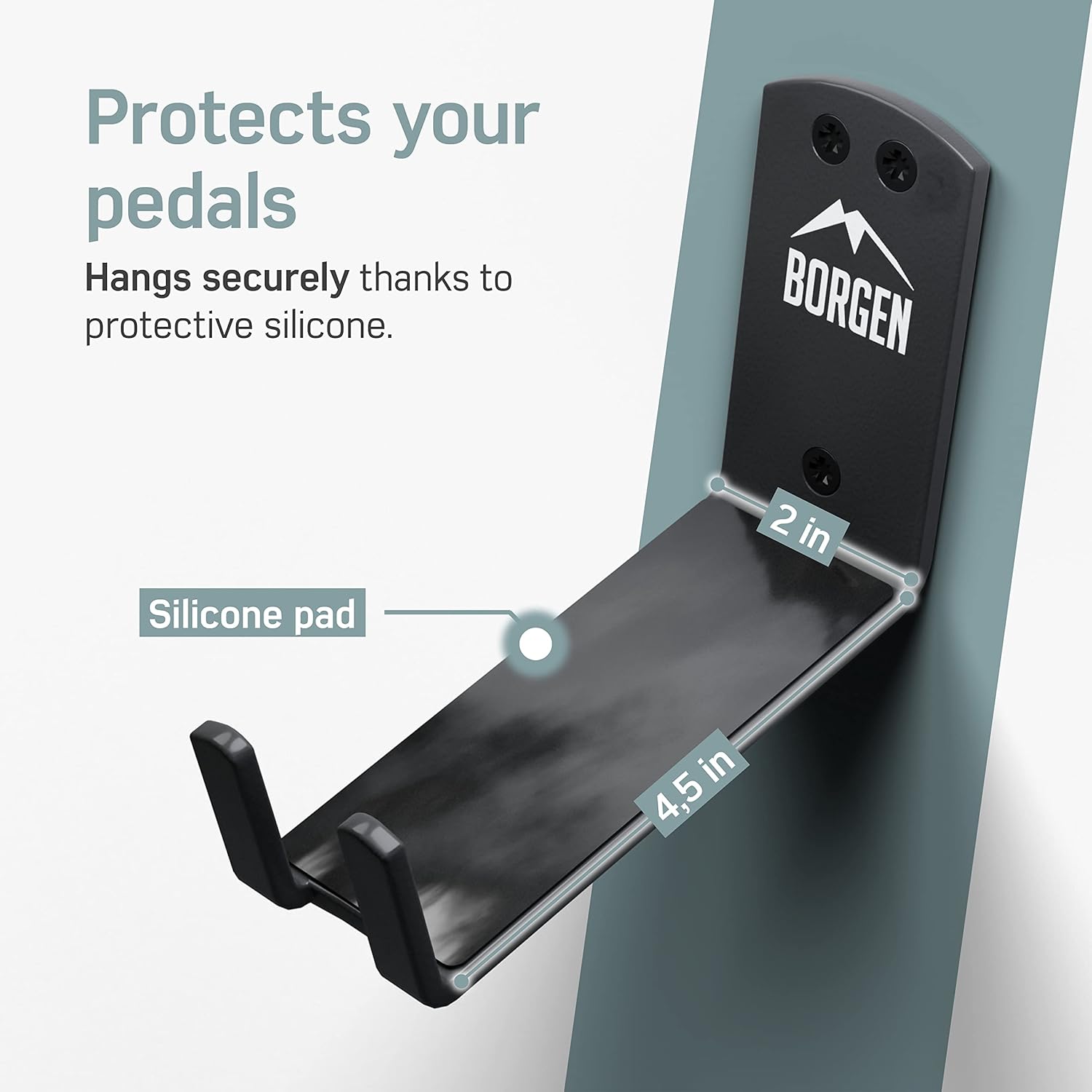 Borgen Bike Wall Mount Pedal Hook for E-Bikes, MTB & Road - Bicycle Wall Mount with Support Brackets and Wall Protection Pads, Suitable as Bike Rack Garage Bike Storage Shed and Bicycle Storage Indoor