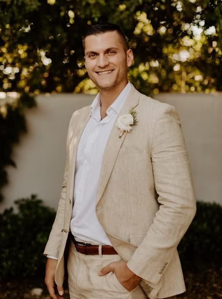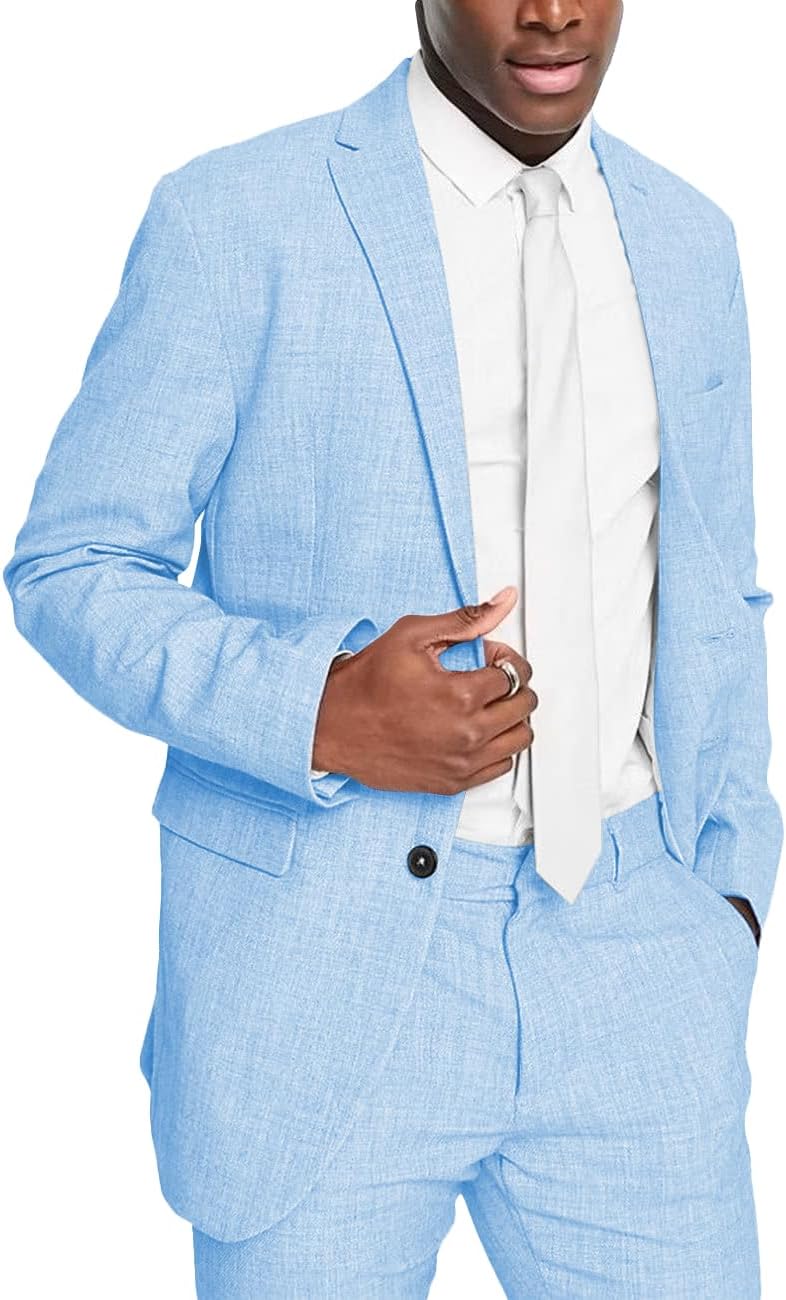 Mens 2 Piece Linen Suits for Men Slim Fit Casual Beach Wedding Summer Grooms Groomsmen Linen Blazer Pants Suit