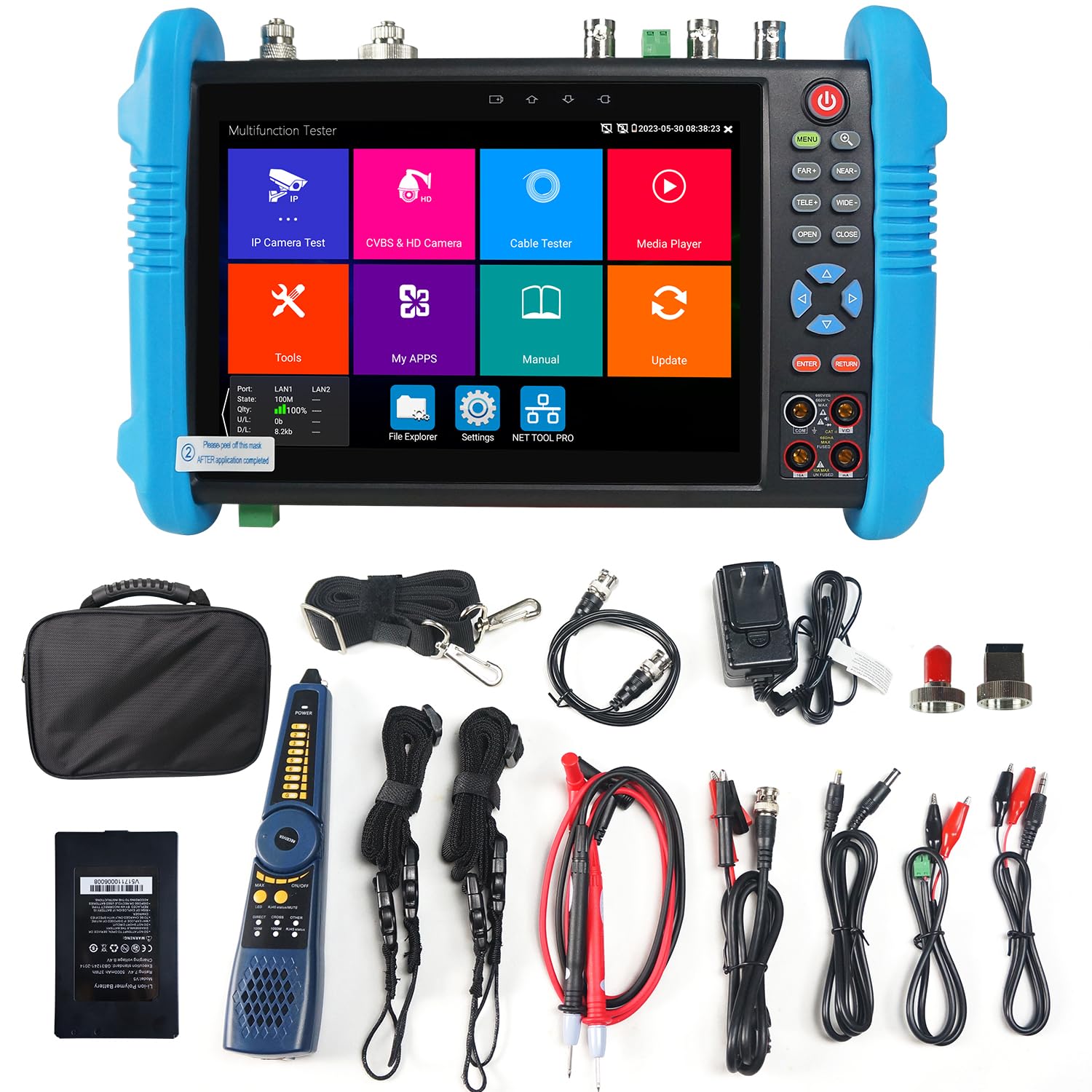 [ Multifunction CCTV Camera Tester ] Built-in porfessional network testing tools,such as Ping, IP scan, DHCP server, PPPOE, Trace Route, Port Flash, LLDP, Link Monitor, etc. Support to analyse wifi signal strength,channel,channel level, etc. It can create WI-FI hotspot. Measurement POE switch or PSE power supply voltage and cable connection status. Power Management: support to check the real-time voltage, power, status of Power output and power input port. Dual Gigabit Ethernet Ports, HDMI in/out, VGA in, Audio I/O, RS485 port, including 8GB TF card. Power input:DC12V 2A. Power output:DC12V/3A, DC24V/2A, DC5V/2A