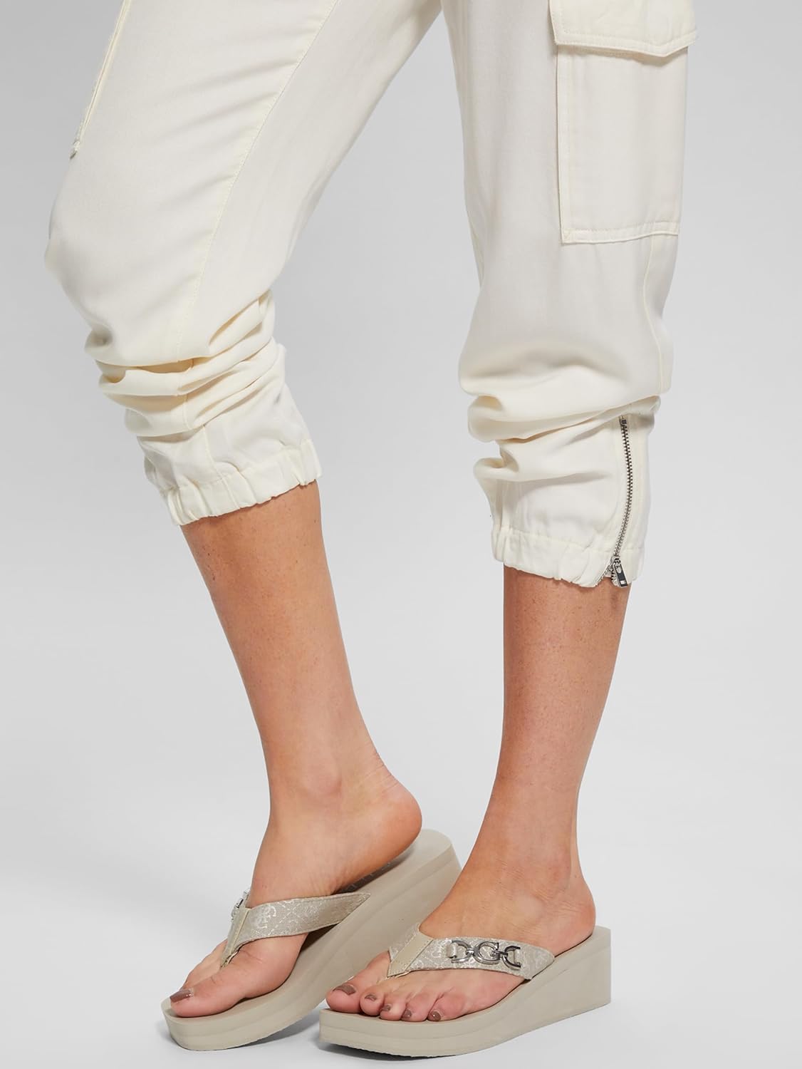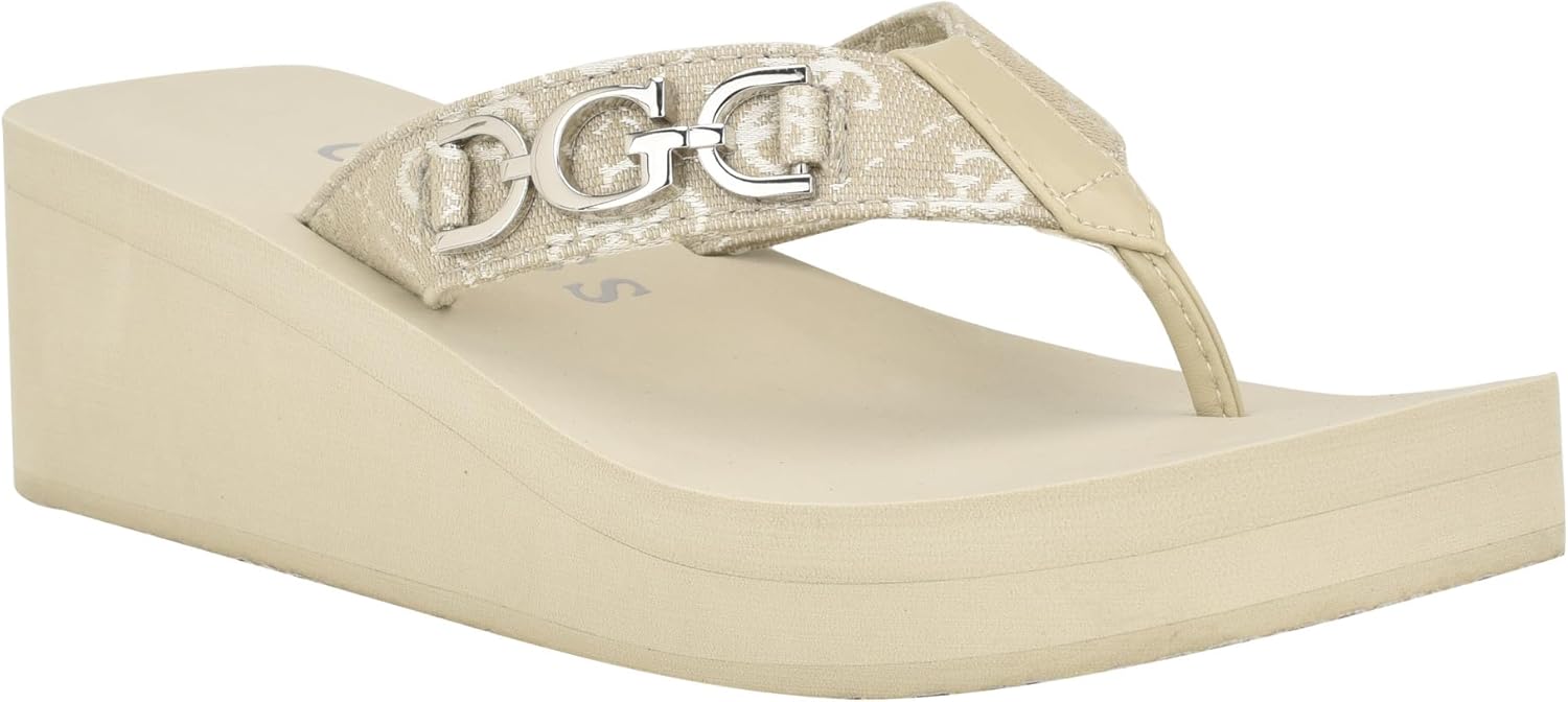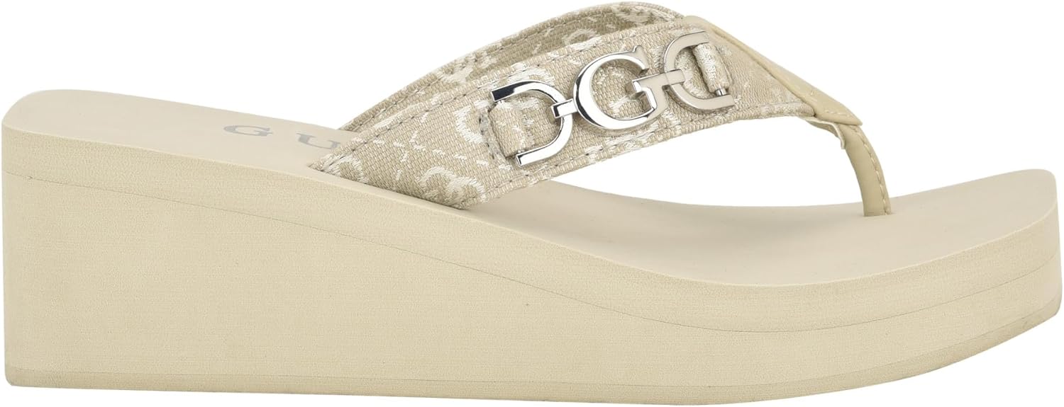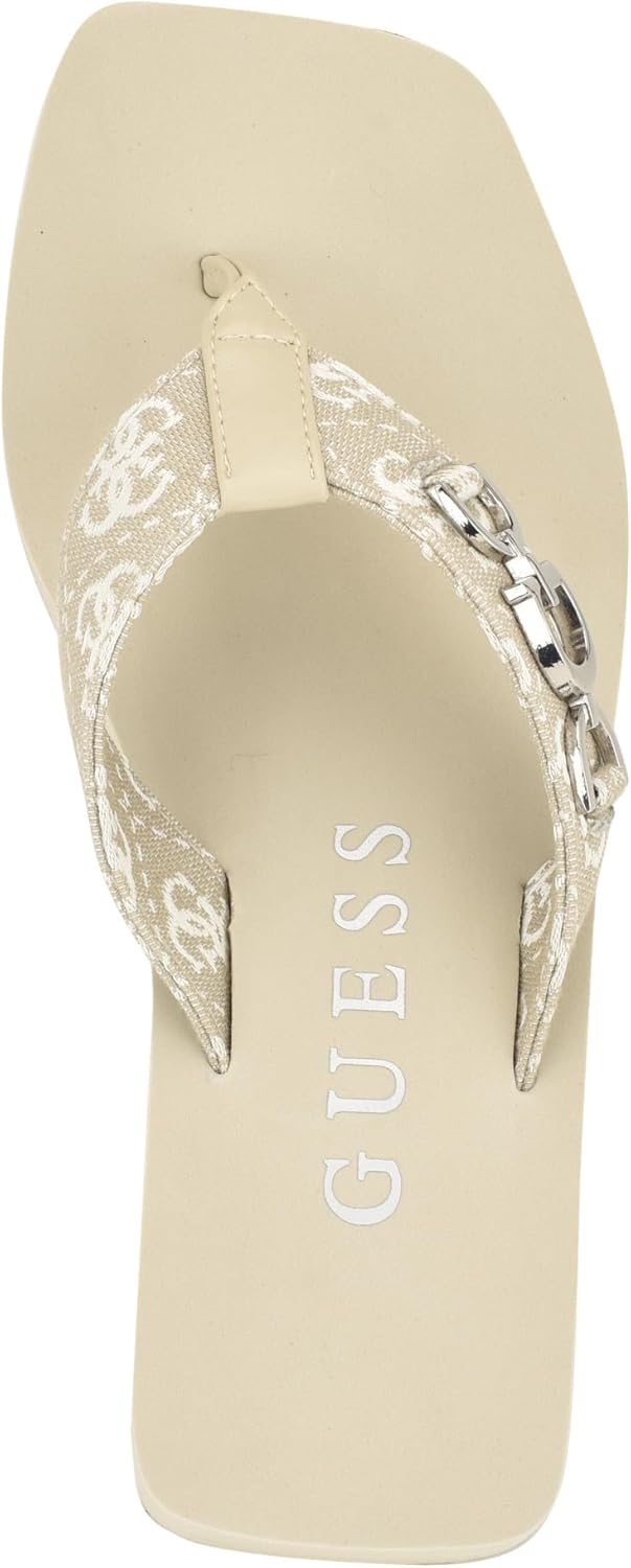 From the beach to the boardwalk, the GUESS Edany wedged flip flop features a comfortable foam platform. Featuring the G chain logo detail on the fabric toe thong adds a little shimmer to your summer.