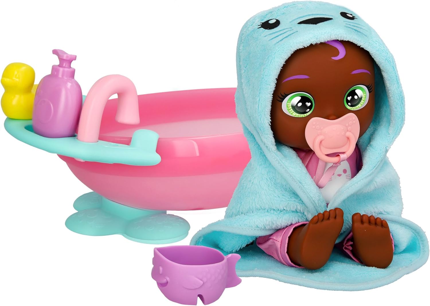 Cry Babies Newborn Tiff is ready to take a bath with her matching bathtub! She reacts to the water with baby sounds! Swaddle her with her personalized blue seal towel to dry her off. It includes 6 accessories. She cries real tears when you press her head.