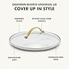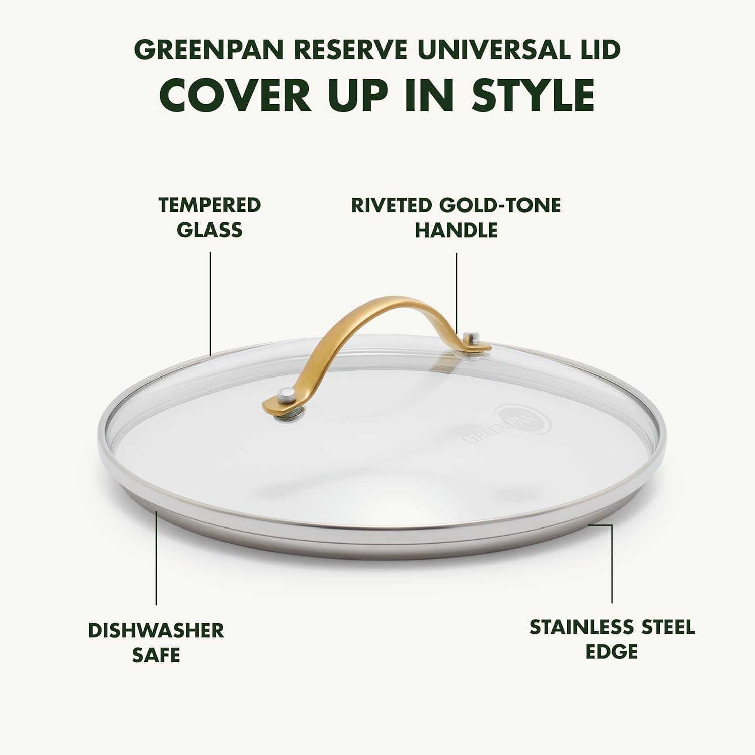 Our GreenPan universal lid helps you lock in the flavor and keep an eye on your food without losing the heat. Made to match our collection, this universal lid will fit any pan with an 8” circumference. Available in multiple sizes, this glass lid features a stainless steel handle with a gold-tone PVD finish that’s wear- and corrosion-resistant. Designed for daily use, this lid can be used in the oven up to 425˚F. Dishwasher safe.