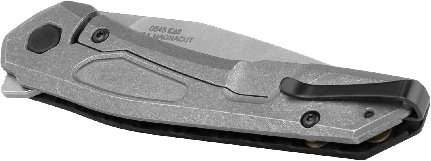 Premium CPM MagnaCut powdered metallurgy blade steel excels in edge retention, corrosion resistance, wear resistance, and toughness; stonewashed finish helps hide use scratches