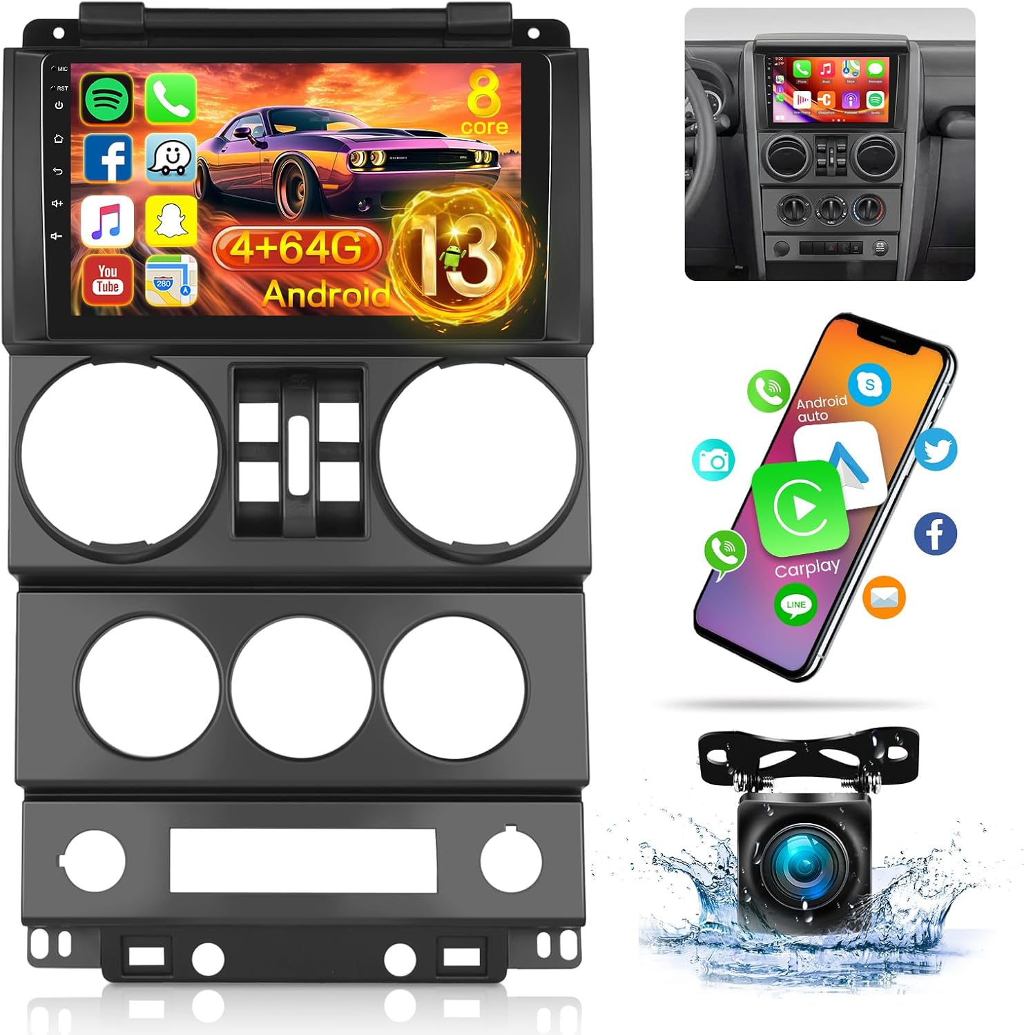 【Vehicle Compatibility & Android 13 System】This Android car radio for Jeep Wrangler 2007 2008 2009 2010 (4 Door). (Please check your Car Model / Year / Shape of The Center Console). This Jeep Wrangler radio comes with a 8-Core CPU, 4GB RAM + 64GB ROM and the latest Android 13 system, making the Jeep Wrangler stereo performance even better.