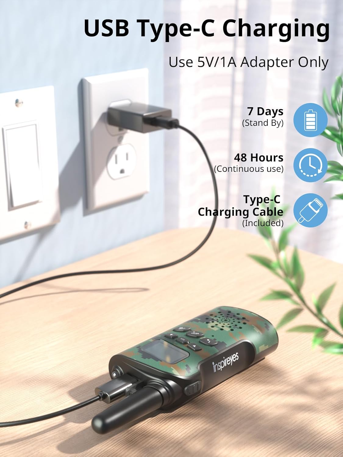 Inspireyes rechargeable kids walkie talkies are rechargeable and long lasting, featuring an upgraded built-in lithium polymer battery. There is no need to buy extra AAA batteries. Kids can enjoy up to 48 hours of playtime and 7 days of standby on a single charge.
