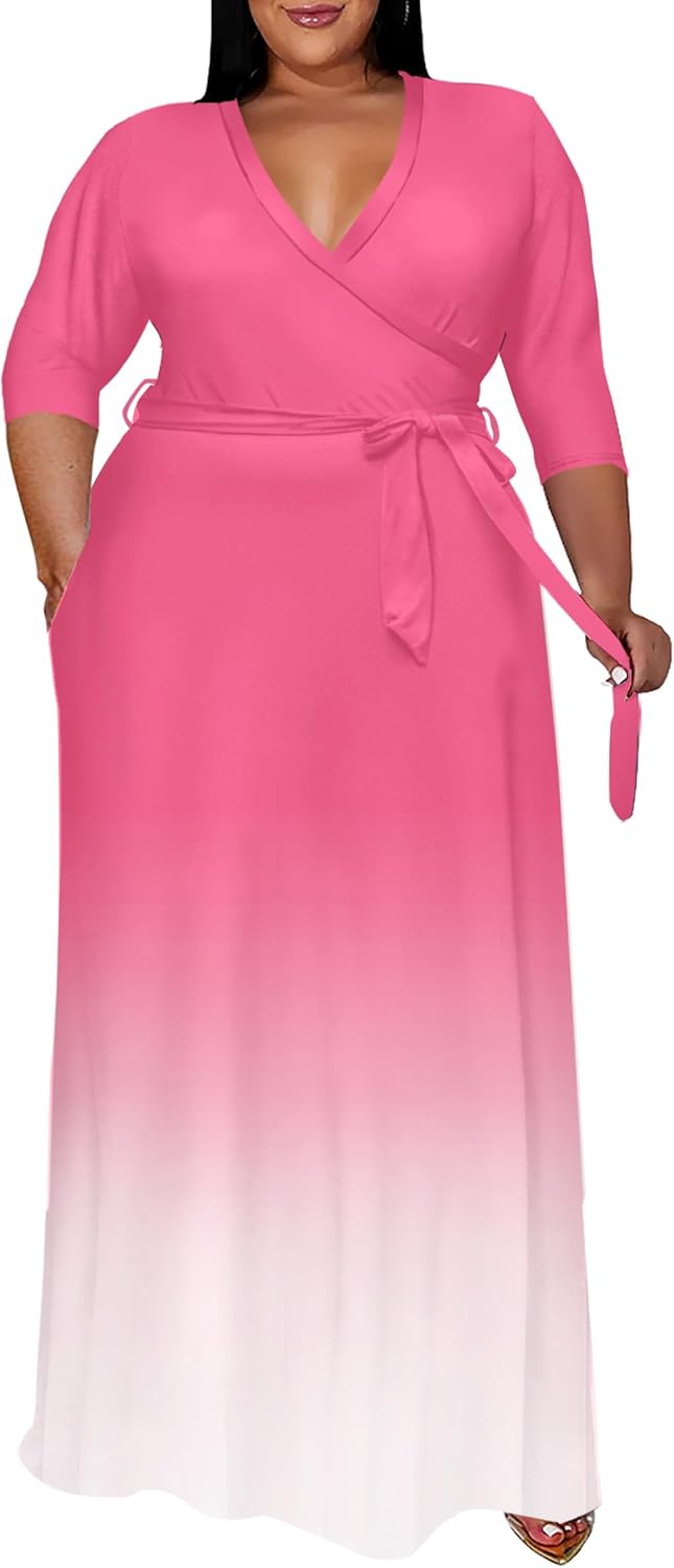 Runwind Plus Size Dresses for Women Gradient Maxi Dress Flowy 3/4 Sleeve with Belt