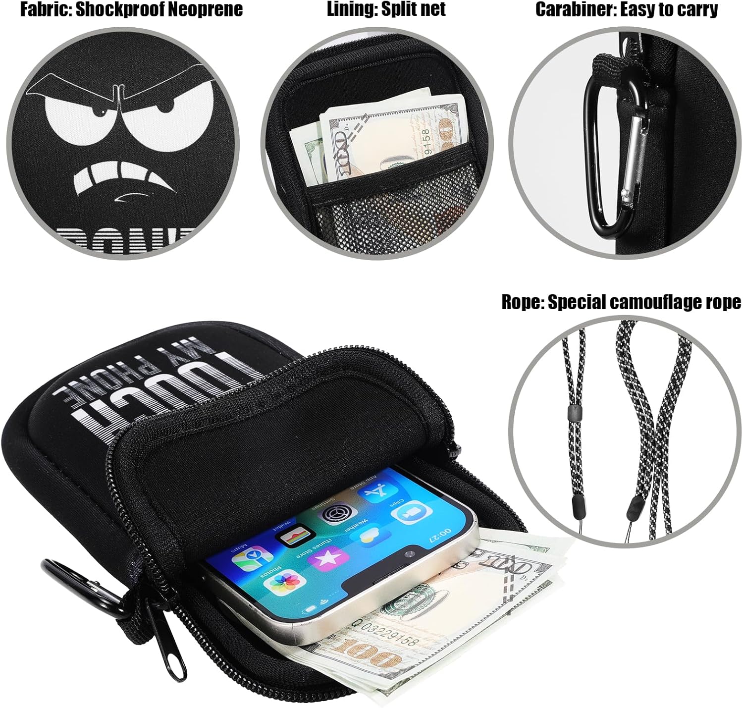 【More Design Details】1. Personalized design "Don't Touch M* Phone" pattern, bold and fun. 2. Have a small mesh pocket interior, convenient to store a few cash, charging cable, ID cards, Credit cards, earbuds and small items. 3. Double zippers ensure the inside items secure. 4. Attached 2 different lengths lanyard strap, you can hold in hand or wear it around the neck.