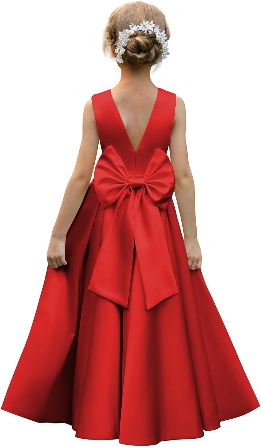 Satin Flower Girl Dresses for Wedding Floor Length Backless Princess Pageant Dress with Bow Pearls Proms Ball Gowns