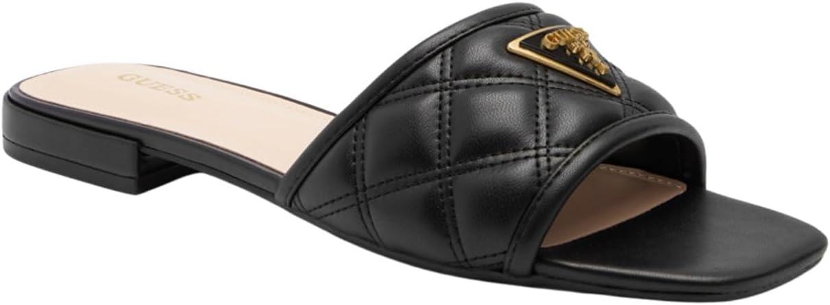 Stay poolside chic or fashionable on your coffee run in the Tameli low heel slide featuring quilted upper and the Guess icon triangle for making a statement.
