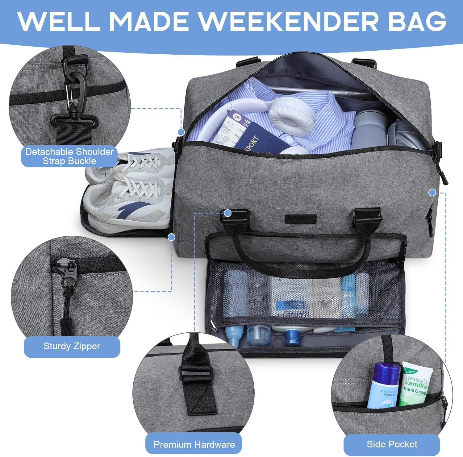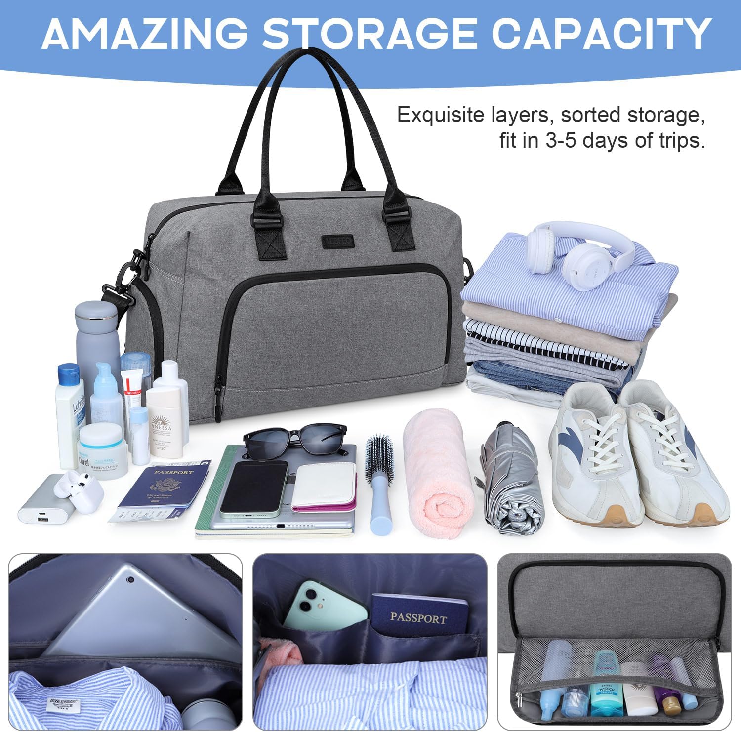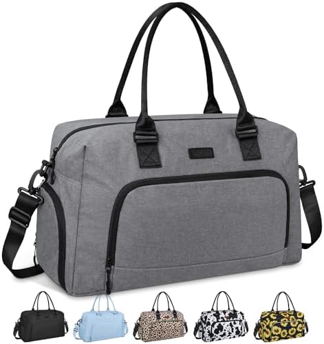 Weekender Bags for Women, LEBFEO Gym Bag for Women with Shoes Compartment, Personal Item Travel Bag, Carry on Overnight Travel Duffel Bag, Hospital Bags for Labor and Delivery, grey