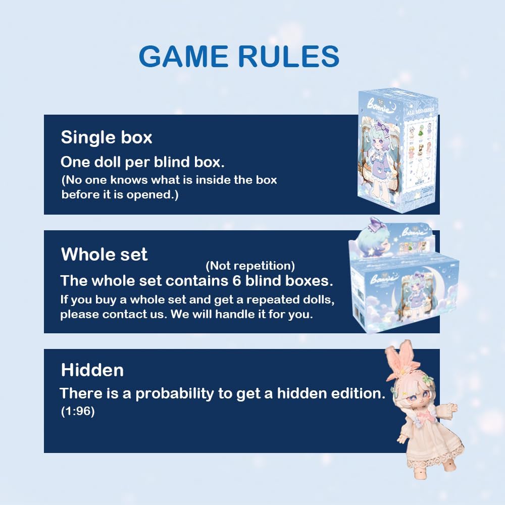 BONNIE SEASON 3:Starry Night Chapter.Figures Size: height about 14CM(5.5inch).Random Design: Each blind bag is randomly arranged.You may get the hidden edition in any single box with a probability of 1/96.