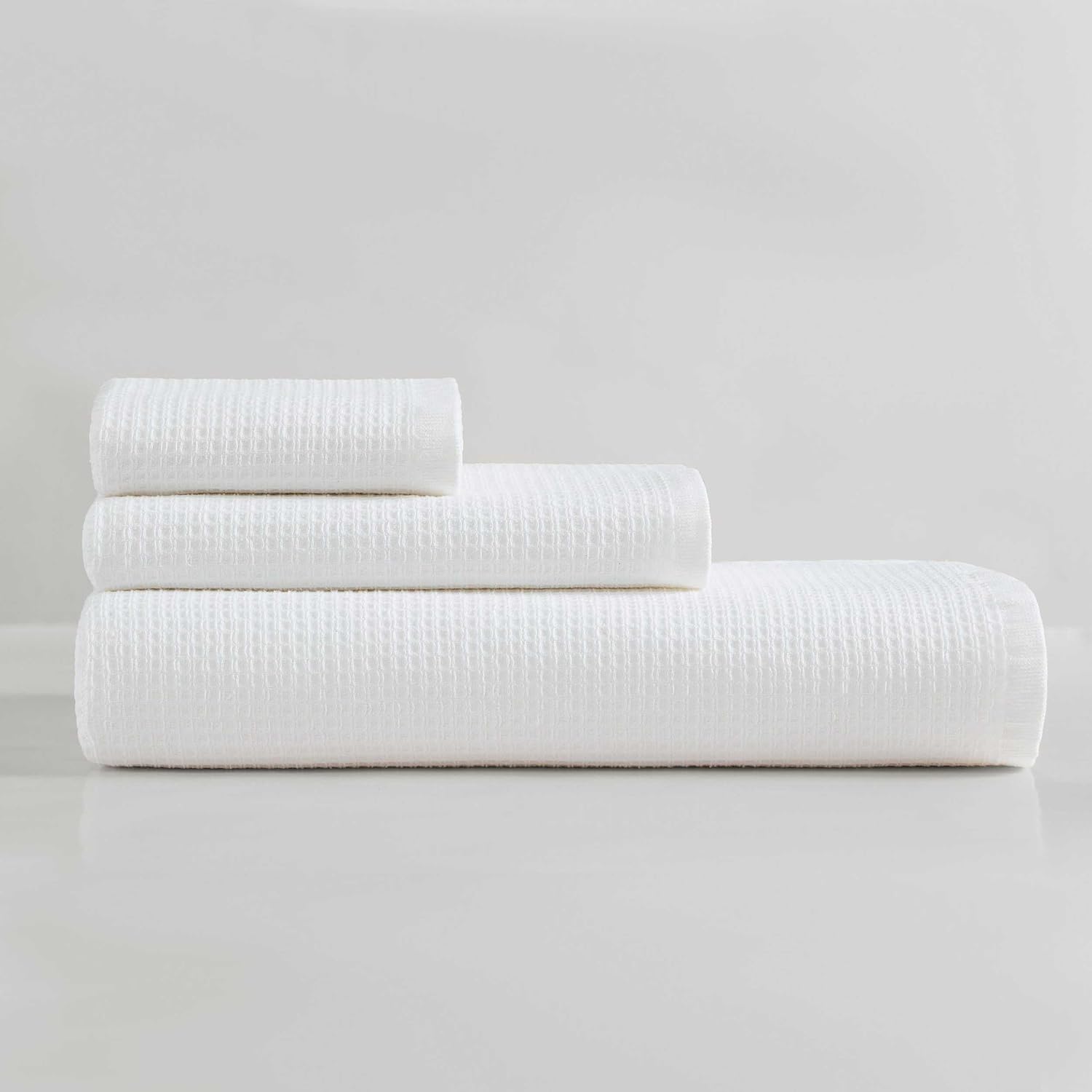 The Eternity Solid 3-Piece Towel Set features a modern design- waffle on the front and terry on the back. Towels are 650 GSM but have a lightweight feel. Each set comes with one bath towel, one hand towel and one fingertip towel. The bath towel features a branded locker loop for ease of hanging. Available in signature Calvin Klein colors and packaged with branded Calvin Klein ribbon and FSC-certified insert cards. Pairs well with the Calvin Klein Essence Bath Rug Set, sold separately.