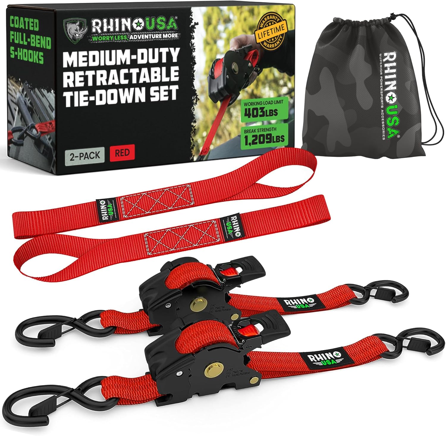 Rhino USA Retractable Ratchet Straps (2-Pack) - 1 Inch x 10 Feet (1,209lb Break Strength) - Heavy Duty Auto Self Retracting Tie Down Straps for Truck, Cargo Trailer, Motorcycle, ATV, UTV - Red