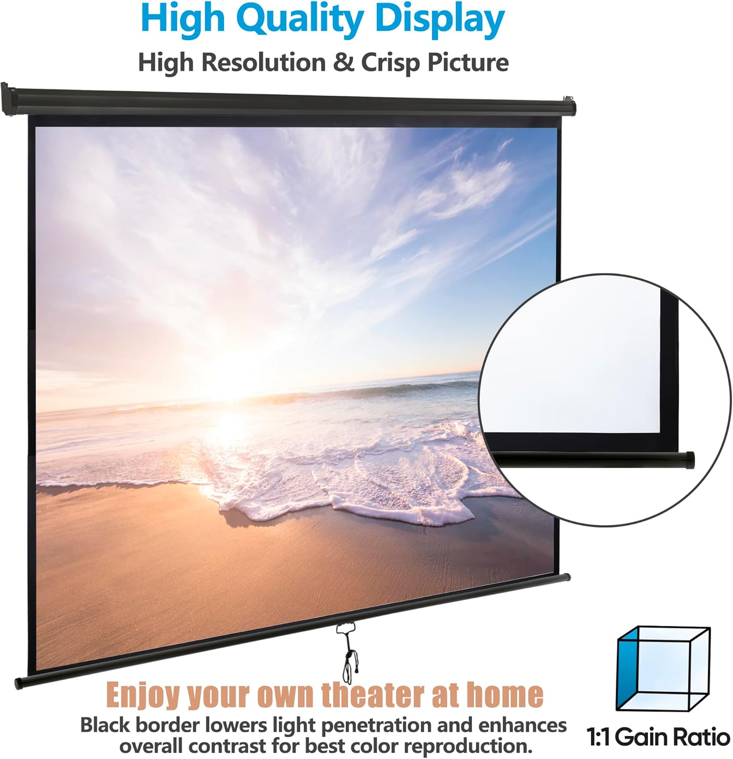 【Premium Screen Material】 Our screen boasts a 1.1 gain and standard black backing to eliminate light penetration. The four side black borders enhance picture contrast, ensuring a crisp and vibrant display. Cleaning is hassle-free – simply wipe the screen surface with mild soap and water.